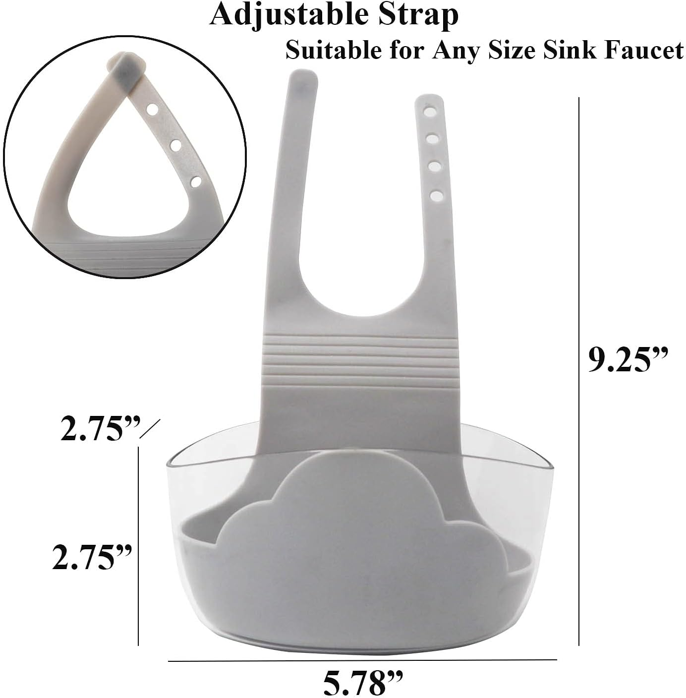 Sink Caddy Sponge Holder Sink Sponge Organizer, Cloud Hanging Kitchen Adjustable Strap Faucet Caddy (2 Pack, Grey) Easy Installation: Each sink sponge holder just buckles around the faucet. No need drill holes on the wall or suction cups which keep falling down. Please note before ordering that if the size is suitable for you. Versatile: Perfect for Holding Sponges, Soap and Cleaning Cloth, Brushes, Lotion Bottles and other small tools. Kitchen sink organizer is great to organize your work space, bathroom, and kitchen. Cloud Design And Clear View: Pretty cloud design inside clear thick plastic shell makes whole sponge holder fashion and high classy. Transparent plastic walls give you a clear view so you can easily find what you need. Good Draining: Holes at the bottom of the silicone sponge holder allow water to drain, let things inside dry fast. Size: 5.78"x2.75"x9.25"(with strap), 2 pack, clear shell+grey inner. Please contact seller if you have any problem with your caddies. We will come back to you within 24 hours. Product Description Cloud Design And Clear View Pretty cloud design inside clear thick plastic shell makes whole sink caddy fashion and high classy. Transparent plastic walls give you a clear view so you can easily find what you need. Adjustable Strap for Almost Any Size Faucet This sponge holder is with adjustable straps. Simple buckle is easy to assemble and disassemble. No drill, nail, suction, screws or glue needed. Allow to remove easily without leaving marks or sticky residue. Details Front Back Bottom Inside Part Number Cloud Hanging Caddy-Grey 2PK Batteries Required? No Number of Items 2 Color Grey Product Dimensions 5.78"D x 2.75"W x 9.25"H Material Plastic Item Weight 9.9 ounces Shape Rectangular Batteries Included? No Mounting Type Wall Mount Number of Compartments 1 Special Features Adjustable Size 2 Pack Special Feature Adjustable Specific Uses For Product Sinks Number Of Pieces 2 Shipping Fast shipping is very important for us. Our expedited US shipping service is FREE!!! Most orders will be shipped within 1 business days upon full payment received. Most orders will be delivered within 2-3 business days after the handling time. We are NOT the postal/shipping company. Items that are delayed or losit in transit are out of our control. We will handle each situation with our best effort in making it right for our customers. We only ship to the confirmed eBay address. We reserve the right to cancel any order for any reason at any time due to address issues. We are not responsible for undeliverable addresses. Returns and payment We offer a 30 days buyer - return policy from purchase date of most items. We allow only eBay approved methods of payment. FeedBack Your feedback very important to us, after you get your package and you are satisfied with our service please leave us positive feedback If you have any problem with your order / any questions please reach out before leaving any type of feedback Please visit our eBay store to check out other items for sale! Thank you for shopping at our store.