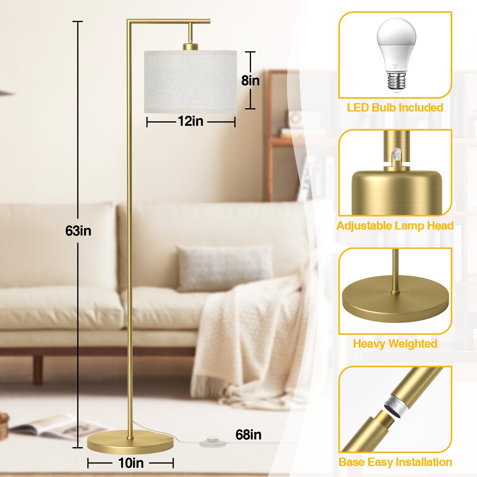 Floor Lamp for Living Room with 3 Color Temperatures Standing Lamp with Adjustable Linen lampshade Tall Lamps for Bedroom Office Classroom Dorm Room 3 Color Temperatures: floor lamp has 3 different color adjustable temperature setting: 2700K/4000K/5000K(Warm white/Cool white/Daylight), which satisfys many different scenes usage. You can easily change the color temperature by the foot switch to set the overall ambiance of the room. Note: The lamp shade color of this reading lamp is beige. Floor Lamp for Bedroom with Adjustable Shade: Modern corner floor lamp comes with a rotating head, you can adjust the lamp shade to any angle you like, so that assures convenience for daily life. Handy foot switch to turn on/off the lamp and change 3 different color temperatures. Spare your hands to do something else, saves you from bending down to turn off the light. Note: Please rotate the lamp head instead of rotating shade directly to avoid damage. Easy to Install: Easy to put together and included the light bulb. made of metal pole and base, this modern tall lamp is stable enough to hold in anywhere and safe to kids and pets not being wobbled by accident. No tools required, just take a few minutes to following the instructions, you can enjoy the tall pole lamp immediately. A Wonderful Present: This living room lamps standing is ideal and perfect present for new house. Simple and elegant design, this standing floor lamp can be matched with any decoration. Perfect for any corner like near desk, sofa, side table,etc. Dimmable Floor Lamp: Our room lamp fits in any room from industrial to modern or traditional decor. you can put standing lamp in living room, bedroom, office or hallway.