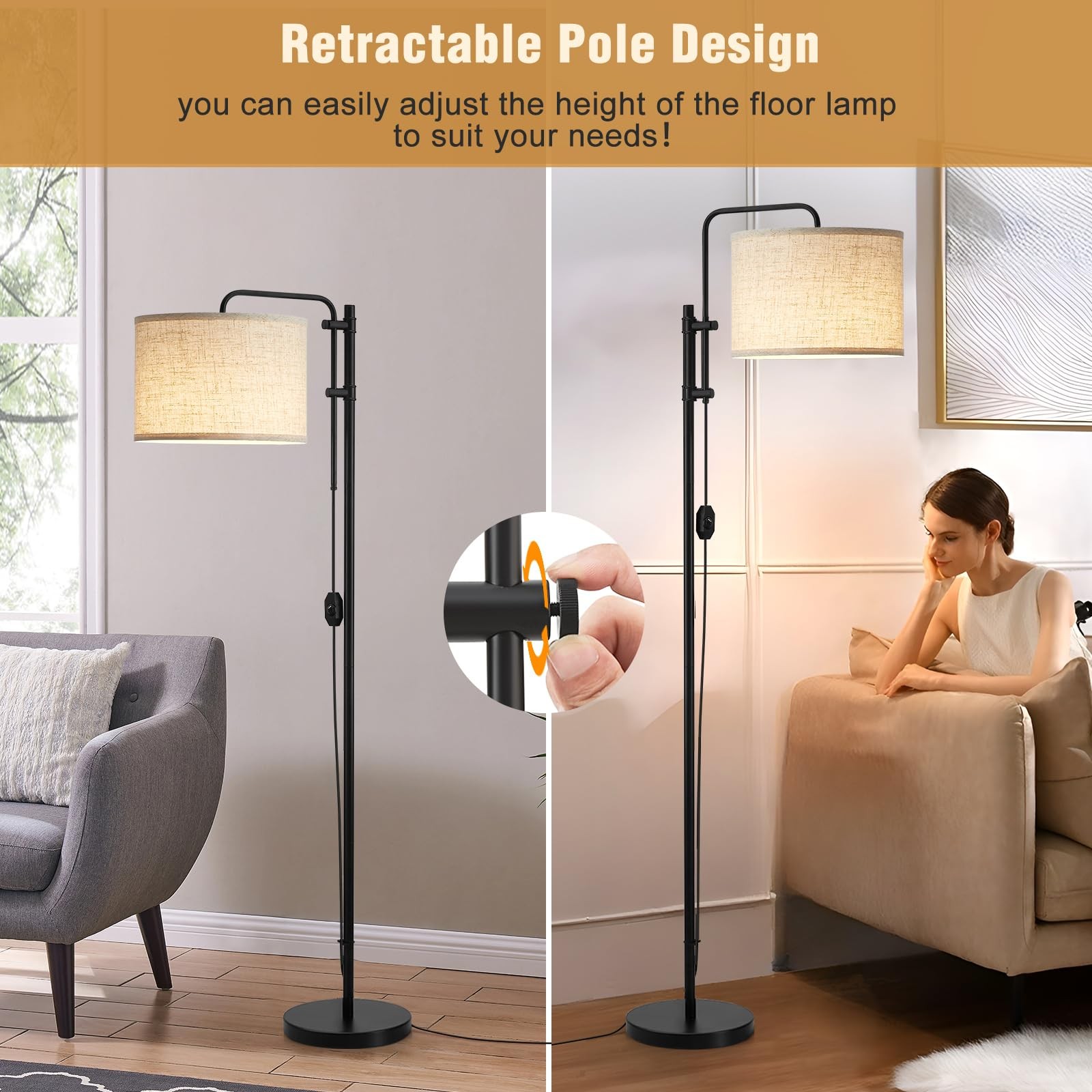 The Floor Lamp for Living Room is the perfect addition to elevate the ambiance of your space. With its adjustable height and 350° rotation feature, this modern tall lamp allows you to customize the lighting angle according to your preference. The beige lampshade adds a touch of elegance and sophistication, complementing any decor style. Standing at 67.5 inches, this dimmable floor lamp provides ample lighting coverage, making it ideal for corners in your living room, bedroom, home office, or any other area that requires additional light. The included bulb ensures you have everything you need to set up and enjoy the warm illumination right away. Designed with both functionality and aesthetic appeal in mind, the Floor Lamp seamlessly blends into your existing furniture while offering versatile lighting options. Whether you want to create a cozy reading nook, highlight artwork, or simply brighten up the room, this adjustable height floor lamp is here to exceed your expectations. Invest in the Floor Lamp for Living Room and transform your space into a cozy retreat where you can relax and unwind. Experience the convenience of adjustable lighting and the timeless beauty of this modern floor lamp, designed to enhance your home decor effortlessly 【𝟯𝟱𝟬° 𝙍𝙤𝙩𝙖𝙩𝙞𝙣𝙜 𝙇𝙖𝙢𝙥𝙨𝙝𝙖𝙙𝙚】The floor lamp comes with a 350° adjustable lamp head. You can adjust the lamp head left or right to choose the right position as needed and choose a perfect angle to create a comfortable lighting atmosphere. (Note: Please rotate the lampshade, do not pull it directly to avoid damaging the lampshade) 【𝘼𝙙𝙟𝙪𝙨𝙩𝙖𝙗𝙡𝙚 𝙃𝙚𝙞𝙜𝙝𝙩 𝘿𝙚𝙨𝙞𝙜𝙣】Our modern black floor lamps have an adjustable height mode. It can be adjusted up to 67.5 inches, and can be freely adjusted and matched according to your preferences to reach a suitable position and enjoy the most comfortable light. The adjustment function can also satisfy your DIY creativity! 【𝘿𝙞𝙢𝙢𝙖𝙗𝙡𝙚】Our modern floor lamp (E26 standard base, including 1 bulb) has a dimmable switch that can adjust the brightness of the light according to different needs in different places. The floor lamp is equipped with a built-in 3000k bulb, which provides soft light and can effectively relieve eye fatigue and protect the vision of family members. This floor lamp can create a perfect atmosphere for any occasion! 【𝙀𝙭𝙘𝙚𝙡𝙡𝙚𝙣𝙩 𝙌𝙪𝙖𝙡𝙞𝙩𝙮】This classic floor lamp is made of high-quality materials, and the beige fabric lampshade has translucency, providing you with a soft and comfortable lighting effect. The lamp post is made of weighted metal material, which is more stable and durable, reducing the risk of tipping or shaking. Whether placed in the living room, bedroom or office, it can bring you comprehensive lighting needs 【𝙀𝙖𝙨𝙮 𝙩𝙤 𝙄𝙣𝙨𝙩𝙖𝙡𝙡 】This black floor lamps is very easy to install, modern floor lamp comes with all necessary installation accessories and manual in the package. According to the picture instructions/manual tutorial, you can easily assemble this exquisite floor lamp. If you have any questions about our floor lamp, please leave a message on , we will provide you with the fastest and friendliest service within 24 hours