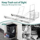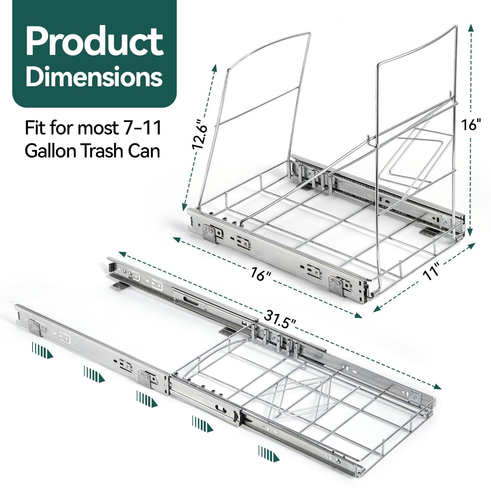 Heavy-duty Construction: The minimum cabinet dimensions required is 13"W x 22"D x18"H,before purchase,please measure the size of your cabinet,make sure there is enough space for this trash can pull out kit,accommodates trash can up to 16"D x 11"W.Our trash can pull out kit under cabinet is made from heavy-duty steel material, designed to withstand the wear and tear of daily use Easy Access: The pull-out trash can shelf with smooth gliding mechanism allows for a smooth and secure sliding motion when you pull out and in the trash bin and easy access to the trash can. You can simply open the cabinet door and slide the bin out for quick and convenient disposal of waste Space-Saving Design: This trash can pull out rack is specifically designed to fit into the narrow spaces beneath your kitchen cabinets, maximizing your kitchen's floor space and keep the trash can concealed within the cabinet, keep it hidden from view. This design helps maintain a clean and clutter-free kitchen appearance,and enclosed design helps contain odors within the trash can, preventing unwanted smells from spreading throughout your kitchen Easy Installation: Easy to install and come with all the necessary hardware for mounting in your cabinet,just need to fix the base with the screws in the package,our trash can pull out kit with front removable basket for garbage bag storage, allow 4.5inch of space for the basket Adjustable to Fit 7-11 Gallon Trash Cans: The bottom of shelf has 4 adjustable lengths: 11.23 inch,13.23 inch,14.45 inch and 15.67 inch,the width is 11 inch,it fits for most 28-35 Qt/7-11 gallon bins