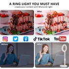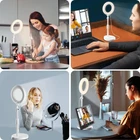DESK RING LIGHT WITH STAND 【 Dimmable Light 】The 5 inch ring light is dimmable which has 3 color modes, each modes has 10 brightness levels, it is soft and bright enough to need your lighting need. It is powered by 5V USB, then computer/laptop/wall charger/power bank can be the power source for this circle light 【 Extendable Stand 】 The ring light table stand is telescopic, height can be adjustable from 8.5inch/21.5cm to 17.3inch/44cm. This makes it easy to place the ring light behind your computer, laptop or monitor. 【 Angle Adjustable 】The connector to ring light on stand is rotatable, then you can adjust the ring light angle easily. Perfect for your Tiktok/YouTube live stream, video recording, photography, make up, selfie, video conference 【 Compact & Lightweight 】 The whole light kit is compact design and lightweight, you can pack them up into a included pouch. So convenient to carry it on when on the go/ travel/business trip, not take much space in your bag or luggage. 【 Built-in Phone holder 】 There is built-in phone holder at the base, you can put your phone or tablet on it. Great for your phone zoom calls or factime with your family or friends.
