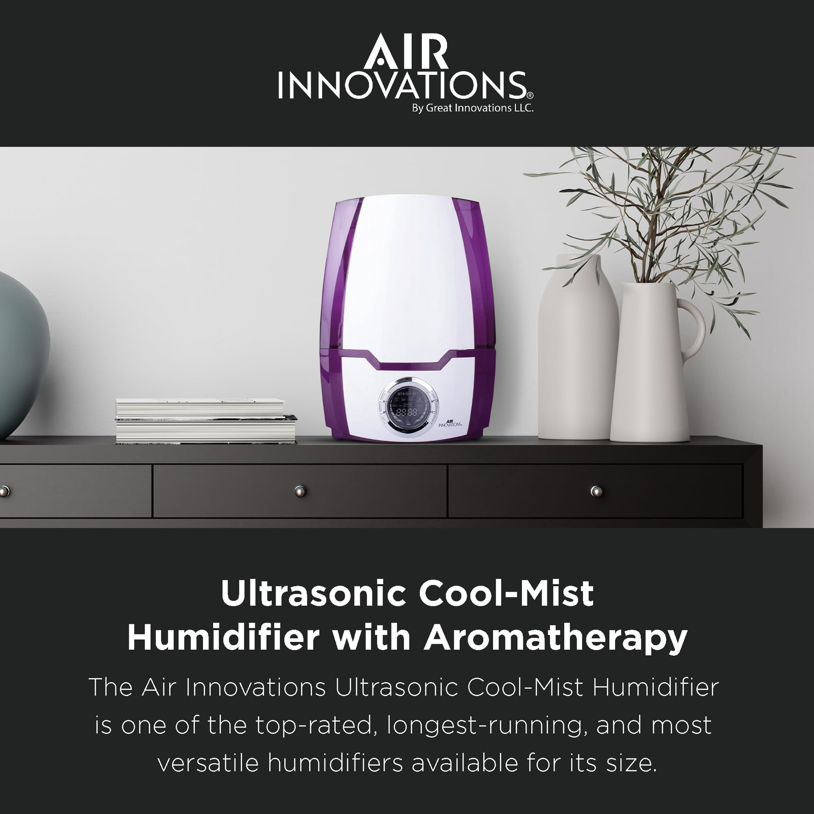Breathe easier with the Air Innovations Ultrasonic Cool Mist Digital Smart Humidifier - Model 505A. For its size, it runs longer and it’s more versatile than any other humidifier on the market. This fully featured unit has a 1.37 gallon tank the runs up to 70 hours on low – that’s almost 9 nights of sleep before you have to refill it. The operation of this humidifier is silent for a peaceful night of sleep, yet it’s powerful enough to add humidity to large rooms up to 400 sq. ft. Other features include: built-in programmable humidistat that monitors and maintains the humidity levels that you set, a permanent ceramic filter that traps impurities from water, and a 360 degree rotating mist nozzle helps direct the moisture where you want it. It also features a fully programmable timer that turns on and off when you want it to, top and bottom handles for easy filling and carrying, extra wide opening for easy filling, and an auto out-of-water shut off when it runs out of water. It will also help kids and babies because the extra humidity will relieve dry eyes, rehydrate skin, help scratchy throats and will help reduce snoring for better sleeping. It also protects and rehydrates furniture, wood cabinets & floors and acoustic & electric guitars. Operates silent for long, uninterrupted sleep Puts clean, pure moisture back into the air Includes Aromatherapy Tray For large rooms up to 400 sq. ft. 4 mist settings: Low, Medium, High, Supreme Permanent ceramic filter never needs replaced Runs up to 70 hours on the low Auto shut off setting Digital LED display for easy operation Dual directional mist nozzle to point mist where you want it Adjustable humidistat to set the humidity level you want 24-hour timer 1.37 gallon tank Measures 9.25" L x 6.5" W x 12.75" H 1-year limited manufacturer's warranty Permanent Ceramic Filter That Never Needs Replacement | Programmable Built-in Humidistat That Monitors And Maintains The Humidity Level You Set 6.2L EXTRA LARGE WATER TANK: Impressive 6.2L super large water tank which keeps your Room-Humidifier running for over 70 hours on a single fill SILENT OPERATION & AUTO SHUTOFF: This baby humidifier runs almost silent to guarantee a full night's sleep without interruption, making it ideal for the bedroom. It also has an auto shutoff for your safety Runs For A Full 70 Hrs On Low (almost 9 Nights Of Sleep) And Is Completely Silent When Running As It Was Designed To Operate Quietly For Uninterrupted Sleep Fully Programmable Timer To Turn It On And Off When You Want It To | Auto Safety Shut Off And Audio Beep When It Runs Out Of Water