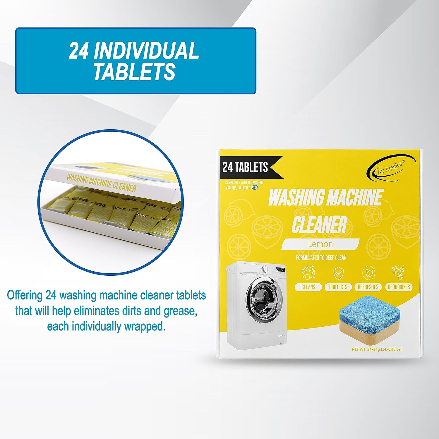 Compatibility: Works with all washers, including high-efficiency and standard top load washer, and front load washer. Compatible with GE, LG, Samsung, Whirlpool, Maytag, Electrolux, and more. High-Quality Laundry Cleaner for Washing Machines: Our washing machine cleaner tablets are designed for soil and mineral residue removal, providing a thorough clean for your laundry machine. Easy Cleaning: Our wash machine cleaning tablets quickly break down into deep scrubbing powder upon contact with water. Simply drop one tablet into the washer tub, run a normal cycle, and wipe away any residue afterward with a towel. Lemon Scented Formula: The refreshing lemon scent ensures that your washing machine is thoroughly cleaned without leaving behind any unwanted odors, providing a truly clean and citrus-fresh environment for your laundry. Monthly Maintenance: Use our washer cleaner tablets once a month to ensure your machine stays clean and fresh. Each package contains 24 individual tablets, providing a year's worth of convenient washing machine maintenance. Product Description Formulated To Deep Clean Air Jungles Washing Machine Cleaner Tablets Washing machine cleaner tablets are formulated to effectively remove dirt, grime, and built-up residue from the inner workings of your washing machine, including the drum and pipes. These tablets help maintain the machine's performance, eliminate odors, and ensure your laundry comes out clean. Discover More Items For Your Home Add to Cart Add to Cart Add to Cart Add to Cart Add to Cart Add to Cart Customer Reviews 4.4 out of 5 stars 88 4.5 out of 5 stars 81 4.5 out of 5 stars 81 4.3 out of 5 stars 54 4.4 out of 5 stars 49 4.0 out of 5 stars 295 Price $9.99 $ 9 . 99 $9.99 $ 9 . 99 $9.99 $ 9 . 99 $8.99 $ 8 . 99 $9.99 $ 9 . 99 $17.95 $ 17 . 95 Laundry Sheets ✘ ✘ ✘ ✔ ✘ ✘ Dishwasher Cleaner ✘ ✔ ✔ ✘ ✘ ✘ Washing Machine Cleaner ✔ ✘ ✘ ✘ ✘ ✘ Wipes ✘ ✘ ✘ ✘ ✘ ✔ Lint Roller ✘ ✘ ✘ ✘ ✔ ✘ Scent Fragrance-Free Lemon Fragrance-Free Lavender Fresh Linen Fresh Scent Size 11g each tablet 11g each tablet 11g each tablet 5.5x4.3 inches — 7x7 inches Count 24 tablets 24 tablets 24 tablets 50 Full Sheets 450 Sheets 50 Wipes