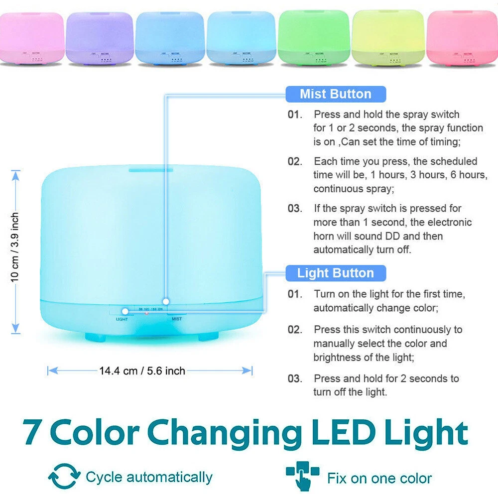 eBay Diffuser Essential Oils Aromatherapy Air Humidifier Natural 7 Colour LED Timer 7 LED MOOD LIGHTS - To match your mood and create the perfect ambience our LED diffuser for home has 7 different colours and multiple mist modes to choose from; you can also leave on overnight and it will auto shutdown when empty. FOOD GRADE M ATERIALS - Made from BPA free PP materials there is no compromise in quality; the buttons and base have a reassuring build quality while the aroma diffuser element is made from the same materials as most baby bottles HUMIDIFIER - Tire d of the dry air caused by radiators? Dryness of the skin, throat or lips? Our mist diffuser is the perfect solution; the benefits of an adequately humid room are vast - from reducing snoring to moisturising skin as well helping your houseplants! THE IDEAL GIFT - Presented in beautiful packaging and with a sleek, minimal design the Deer & Oak oil diffusers for home are to everyone's taste; add essential oil for atmosphere and relaxation on another level 500 ML - At 0.5 Litre capacity the electric diffuser will last up to 16 hours on a full tank and powerful enough to impact most room sizes. Using our scent diffuser, fill your room with diffuser oil, such as lavender essential oils! LIGHT COLOR -Green, Dark Blue, Red, Sky Blue, Yellow, Purple, White ( Each light is adjustable between bright and dim.) Product Specifications: Power Input: USB Plug-in Electric Consumption: Approx 5W Tank Capacity: Approx 500ml Timer Mode: 1H-3H-6H-ON LED Light: 7 colors Ultrasonic Frequency: 3MHz Noise: < 35dB Material: PP Weight: 300g Dimensions: 14.4x10cm / 5.6x3.9inch Color: White Light Color: Green, Dark Blue, Red, Sky Blue, Yellow, Purple, White ( Each light is adjustable between bright and dim.) Package Include: 1 x Aroma Diffuser 1 x Remote Control 1 x User Manual