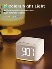 4-in-1: Designed with sound machine, alarm clock, Bluetooth speaker and night light in one integrated machine, help you relax and fall asleep easily, wake up gently. Extra USB charging port ensure your devices are fully charged while you rest. Sleeping Better with 25 Soothing Sounds: Get a peaceful sleep with 5 white noise, 5 fan sounds and 15 nature sounds. With precise 30-level volume control to create a personalized sleep environment, suitable for adults babies and kids. Bedside Digital Alarm Clock: Wake up gently with 8 alarm sounds ( bird chirping, piano, windbell, soft music, brook, wave, buzz and beep) and 0-100% adjustable display dimming, gradual volume control for a smooth morning routine. 5W Stereo Bluetooth Speaker: Sound machines features high-fidelity 5W stereo speaker that deliver loud and clear alarm sounds. It also doubles as a wireless speaker with Bluetooth 5.0 technology, allowing you to stream your favorite music, audiobooks, or podcasts. 8 Color Night Light: Choose from 8 lively colors to create a relaxing and sleeping-friendly ambience. With 4 adjustable brightness levels and off option, no interruption for sleeping and guiding at dark night. Stylish Modern Design:Combining fabric and wooden finishes for a modern touch of elegance. Compact size (3.4"x 3.2"x 2.5") fits seamlessly into any space for a perfect sleep experience at home, in the office, or while traveling.
