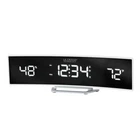 Fashionable curved clock and weather instrument offers curve-appeal. Offers dynamic white LED display with a mirrored lens which can be seen from across the room and in darkened rooms. Features dual alarms with adjustable settings: HI/LO sound volume, programmable alarm days, snooze duration (5-60 mins), and auto-dim. Displays your current indoor temperature (F only) and humidity and can charge a mobile device with bonus USB port in the back of the clock. Table standing clock operates on included 5V adapter and (optional, not included) one CR2032 coin cell battery for power backup. With controllable intensity settings, this indoor clock/thermometer is great for viewing in the night! Curved glass screen with white LED display 12/24 hour manual time display Daylight saving time reset (on/off switch) Indoor temperature (°F) and humidity (%RH) MIN/MAX temperature and humidity values Dual alarms with high/low sound control and programmable alarm days (7/5/2 alarm settings (Daily/Weekday/Weekend) Snooze duration (adjustable 5-60 mins) Adjustable backlight (HI/LO/OFF) and Programmable Auto-dim feature USB output: 1 Amp maximum current Table stand only (cannot wall hang) Indoor temperature range: 14°F to 122°F 5V DC adapter (included) optional 1 CR2032 battery (not included) for power backup (does not operate clock, maintains time/alarm settings) Alarm: Yes Batteries Required: Batteries Required Clock Display Type: Digital Clock Face Material: Glass Clock Frame Material: Plastic Clock Shape: Irregular Color Family: White Color/Finish: White Features: Alarm,Battery Backup, Non-ticking, Pedestal base, Volume Control Includes: No Batteries Included Movement: Electronic Number of alarms: 2 Power Type: Plug-in Product Weight (lb.): 0.35 lb Returnable: 60-Day Style: Glam, Modern Manufacturer Warranty: 1 year limited parts and labor Clock Face Length (in.): 8.45 Clock Face Width (in.): 1.00 Clock Width: Small (Under 12 in.) Product Depth (in.): 1.75 in Product Height (in.): 2.78 in Product Width (in.): 9.84 in Program to automatically dim backlight for evening hours Power your phone or digital camera with its USB port Two alarms to program 1 for the weekend and 1 for work week 100% Customer Satisfaction Guarantee Customer satisfaction is our number one priority! As long as you are happy with your purchase, it would mean a lot to us if you could leave us a positive feedback to let us know that we are doing a good job. If there are any problems with your purchase, please contact us first and we will resolve the issue for you. Shipping Free Shipping Within The US We ship our merchandise directly to you for FREE from different warehouses across the United States. International Shipping We ship internationally through eBay's global shipping program. therefore international shipping charges are set by eBay and not by us. If you are an international buyer, you can view the final charges when you confirm your delivery details at checkout, before you pay. Electrical Items Disclaimer These products are manufactured according to the specifications of the US Electrical Standards and codes. If you purchase this product to use in a country outside of the United States we cannot guarantee it will work properly. We assume no responsibility if the item malfunctions or causes an accident because you tried to use the product with foreign electrical standards. The use with a converter or other voltage transforming device is at your own Risk. Please Note: Products are designed and rated for use in the US using 120 volt current. With or without a transformer, this product is not recommended for use outside the US.