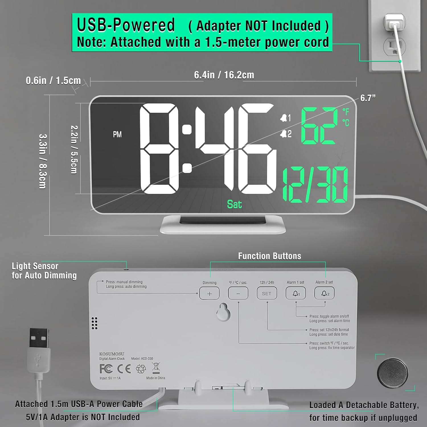Alarm Clock for Bedroom, 6.7" Led Desk Digital Clock,Mirror Clock,Dual Alarm Clock for Living Room with Seconds,Date,Week,12/24H,Dimming,Temp [Desk Clock] This white LED alarm clock features a 6.7-inch LED display with a sleek mirror clock style. It includes dual alarms, 12/24-hour format, seconds, date and day of the week, temperature (℉ / ℃), and auto/manual dimming. This makes it a stylish and modern desk alarm clock. Additionally, the clear numbers make it convenient and easy-to-read for seniors as well. [Twin Bell Alarm Clock with Snooze] You can set two alarm times, each with 3 different alarm cycles for workdays, weekends, and every day as options. The LED clock also includes a snooze function. When the alarm rings, the snooze button can be pressed to gain an extra 5 minutes of snooze time. [Auto/Manual Dimming] This light alarm clock features an auto/manual dimming function. You can set the brightness to low, medium, high, or turn the LED display off. Alternatively, you can set the clock to automatically adjust its brightness based on the surrounding environment. This feature adds a cool and customizable element to the clock. [Digital Clock with Time/Date/Week] The LED table clock features a multi-display that includes the time, date, and day of the week. This bedroom clock not only serves as a cool aesthetic alarm clock but also as an electronic calendar. Additionally, you can set separate alarms for your workdays, weekends, and every day. [Plug-in USB Power Supply] This digital clock requires a 5V/1A AC adapter (not included) to operate. It also comes with a button battery, which is used to preserve the time during power outages. [Customer Services] We offer a 2-year warranty on our product. If you encounter any quality or usage-related problems, please don’t hesitate to contact us via email. We will promptly assist you in resolving the issue. ORDER NOW RETURNS If, however, you wish to return your item, we will be more the happy to refund you in full so long the item is not damaged, used, and in its original packaging. This option is only valid for 30 days after the purchase date. Please note, the cost for postal returns for your item will be at your own expense. SHIPPING We offer FREE shipping on all orders! We ship within a few business days of payment. Furthermore, we use a selection of shipping services such as UPS, FedEx, USPS, etc. Humble Request To All Costumers! If you are happy with your purchase and the service we have provided, please kindly leave positive feedback, however in any unlikely event if you are not happy with your purchase or our service. Please do not hesitate to contact us via email before you leave Neutral or Negative feedback. You are our no. 1 priority, and we will do our best to keep you happy and satisfied.