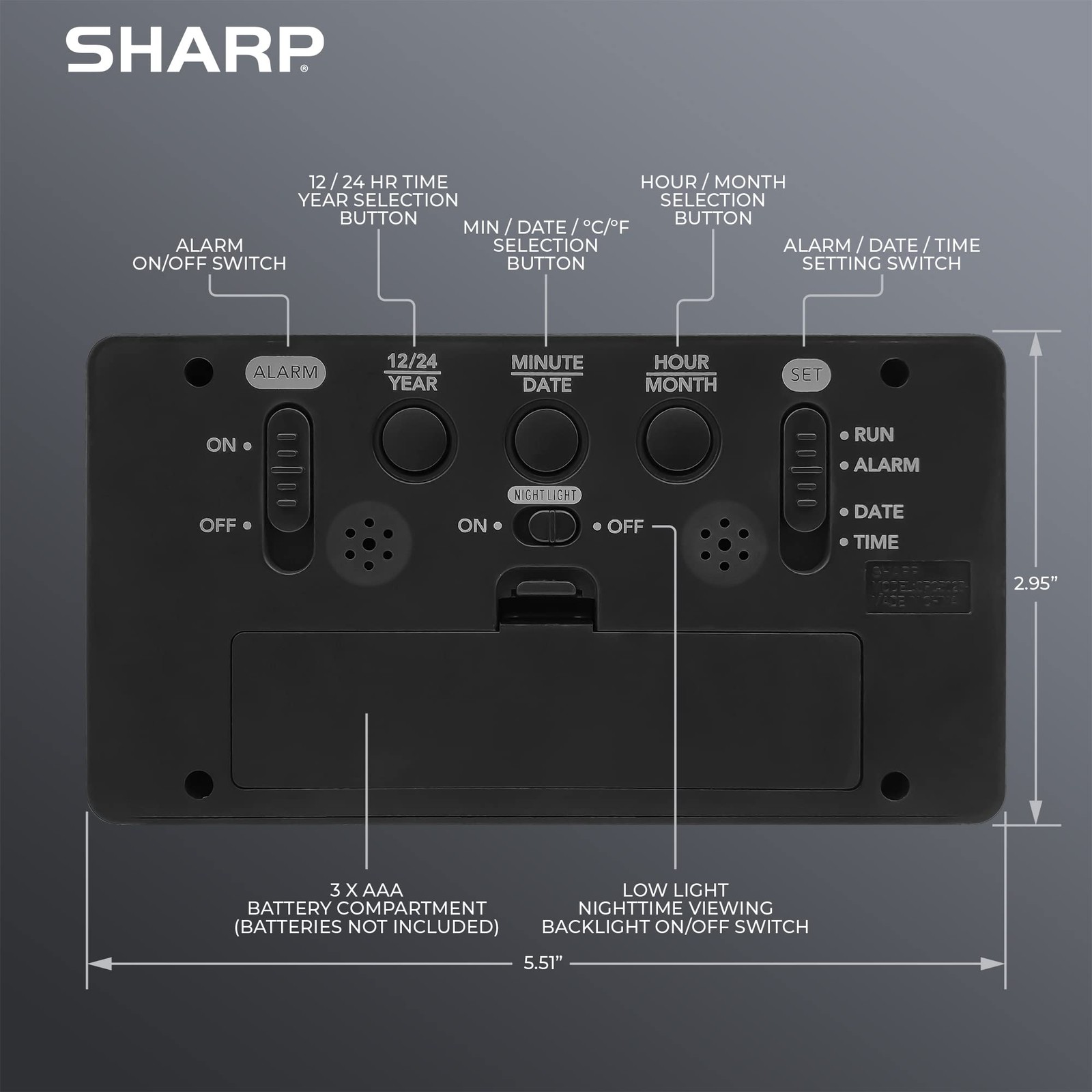 The night light digital alarm clock measures 5 1/2 (L) * 1.5 (W) * 3 (H) inches, small and light. The jumbo 1.8” tall LCD display makes it easy to read across the room. The small simple clock is perfect for anywhere you need a clock - bedroom, bathroom, kitchen, den, desk, office, kid’s room, on top your cable box or streaming box – it will fit anywhere! The clock features a built-in display nightlight that can be easily turned on with a simple on/off switch. Clock also features an On-Demand White Backlight with a push of a button on the top of the clock to give you 5 seconds of full brightness making it easy to see. Ascending alarm for the clock has a gradually faster beep alarm with a 9-minute snooze Indoor temperature display to allow you to monitor the temperature in the room. Easy to Read display also features a calendar with the month and date shown. Battery Operated (3 x AAA Batteries, Not Included) - Large 1.8” tall LCD Display with White Backlight Display Nightlight with ON/OFF Switch – Visible backlight in the dark 5 Second Full Brightness On-Demand Backlight Alarm Time Display Calendar Display Indoor Temperature Display Ascending Alarm Volume 9 Minute Snooze Alarm Battery Operated (3 x AAA Batteries, Not Included)model: SPC5025 The night light digital alarm clock measures 5 1/2 (L) * 1.5 (W) * 3 (H) inches, small and light with a tactile rubberized black finish case with a unique feel - The jumbo 1.8” tall LCD display makes it easy to read across the room. The small simple clock is perfect for anywhere you need a clock - bedroom, bathroom, kitchen, den, desk, office, kid’s room, on top your cable box or streaming box – it will fit anywhere! The clock features a built-in display nightlight that can be easily turned on with a simple on/off switch. Clock also features an On-Demand White Backlight with a push of a button on the top of the clock to give you 5 seconds of full brightness making it easy to see. Ascending alarm for the clock has a gradually faster beep alarm with a 9-minute snooze when you need a little extra sleep Indoor temperature display to allow you to monitor the temperature in the room. Easy to Read display also features a calendar with the month and date shown. Battery Operated (3 x AAA Batteries, Not Included) Clock model: SPC5025