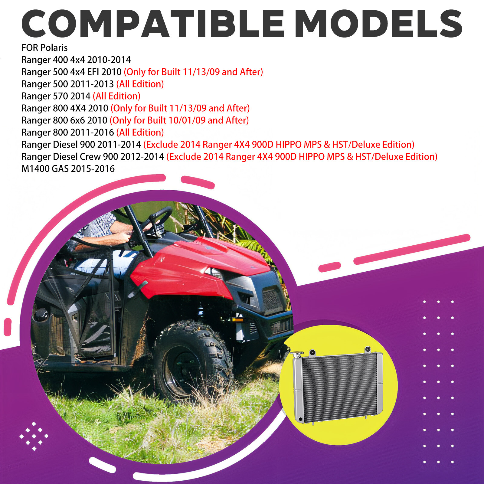 Aluminum Radiator w/ Cap for Polaris Ranger 400 500 570 800 900 Crew 2010 - 2016 Note: Please Compare Your Original Unit With The Picture. 100% Brand New and High Quality. Product Info: Our stock photos shown are of the actual item. IN STOCK AND READY TO SHIP REPLACE OEM PART Number: 1240528 1240527 1240720 1240721 MOTO1988®Brand Products This part fits the following models: Fit for Polaris Ranger 400 4x4 2010-2014 Ranger 500 4x4 EFI 2010 (Only for Built 11/13/09 and After) Ranger 500 2011-2013 (All Edition) Ranger 570 2014 (All Edition) Ranger 800 4X4 2010 (Only for Built 11/13/09 and After) Ranger 800 6x6 2010 (Only for Built 10/01/09 and After) Ranger 800 2011-2016 (All Edition) Ranger Diesel 900 2011-2014 (Exclude 2014 Ranger 4X4 900D HIPPO MPS & HST/Deluxe Edition) Ranger Diesel Crew 900 2012-2014 (Exclude 2014 Ranger 4X4 900D HIPPO MPS & HST/Deluxe Edition) M1400 GAS 2015-2016 Package: Aluminum Radiator x1 Cap x1 Payment Delivery details Terms of sales About us Contact us Payment We only accept payment by PayPal. PayPal is the only online payment method we accept. Please make sure you have a valid/confirmed PayPal account prior bidding. Delivery details Note: Warehouse and logistics companies have been severely short of staff recently. And because of too many parcels backlog in peak season, staff can not timely processing. As a result, the delivery of parcels has been slow recently. If you urgently need to receive the goods, please contact us to consult the logistics delivery time before purchasing. 1. We ship to EBAY'S ADDRESS ONLY. So please confirm your address is correct, and if you want to change the delivery address, just feel free to contact us when you purchase. 2. Item will be shipped within 2 business days after payment confirmation. 3. We will ship this item to buyers by USPS - First Class Package(Standard 3-5 Business Days) or USPS - Priority Mail or UPS - Surepost (Economy 1-6 Business Days). Please pay attention that import duties, taxes and charges are not included in the item price or shipping charges. Check with your country's customs office to determine what these additional costs will be prior to buying. Thank you. Terms of sales If you receive the item that have any quality problem or damaged, please feel free to let us know and provide the photos. We offer free replacement or full refund if it's our responsibility that causes the mistake. But we will not accept the return if the item damaged by the buyer's operational errors. If you are not 100% satisfied with the items for other reasons and ask for refund. Please be noted that only the listing price excluding shipping fee would be refunded. Items should be returned with original packages. About us Please feel free to contact us anytime if you have any questions. If you are satisfied with our items and service, leaving us an ALL-5-STAR and positive feedback would be greatly appreciated. Your encouragement will keep us moving forward. Your satisfaction is our final goal! Contact us We care about our valued buyers. We aim at satisfying every visitor, no matter what kind of situation you meet with, we will be right here to serve you. If you have any questions, our Customer Service staffs will be very glad to help you. We try our best to reply to your emails as soon as possible. Please allow 24 business hours for us to respond. Brand MOTO1988 Type Radiator Manufacturer Part Number 1240528 OE/OEM Part Number 1240721, 1240720, 1240528, 1240527 Interchange Part Number 1240721, 1240527, 1240720, 1240528 Item Height 5.5 Item Length 21 Item Width 20 Items Included (1) Radiator, (1) Cap Manufacturer Warranty 1 Year Material Aluminum Performance Part No Superseded Part Number 1240721, 1240527, 1240720, 1240528 Universal Fitment No Vintage Part No Color Gray Reference OEM Number 1240721, 1240720, 1240528, 1240527 Compatible Type ATV Compatible Year Range 2010-2017 Compatible Make for Polaris Compatible Model Ranger 400,500,570,800,900,Crew Placement on Vehicle Engine Compartment Features easy fit