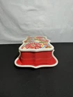 Add a touch of elegance to your kitchen with this beautiful covered butter dish from Anthropologie. The dish features a red floral pattern that will brighten up any table setting. The glossy finish on the ceramic material makes it easy to clean and maintain. This covered dish is perfect for keeping your butter fresh and presentable. It is not part of a custom bundle and is the ideal addition to your dinnerware collection. Use it for special occasions or everyday use, and impress your guests with its stylish design.