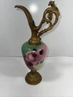 This antique French ewer is a stunning hand-painted glass vase with painted metal mounts. Standing 15 inches tall, this vase features a floral pattern and a French style, making it a beautiful and unique decorative piece. The vase is from the late 19th or early 20th century, originating from France, and weighs 2.5 lbs. Its antique finish adds to its charm, and the intricate detailing showcases its craftsmanship. Perfect for collectors or those looking to add a touch of vintage elegance to their home decor.