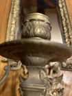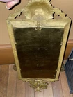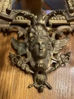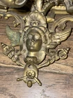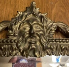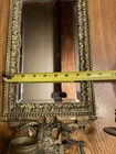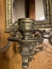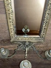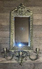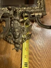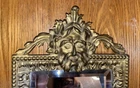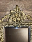 This is an Estate Sale find. It will be sent to you in the condition in which it was found. I believe it is brass as a magnet does not attach. This is an Antique Poseidon? Wall Mirror with a Triple Sconce design in Gold Brass. There is also a woman at the bottom at the mirror. The mirror features a Mythological Greek theme with a beveled edge glass. It has a Victorian style and measures 22 inches in height and 8.5 inches in width. The frame is made of brass with a mirrored finish, giving it an antique look. This is a large heavy piece.