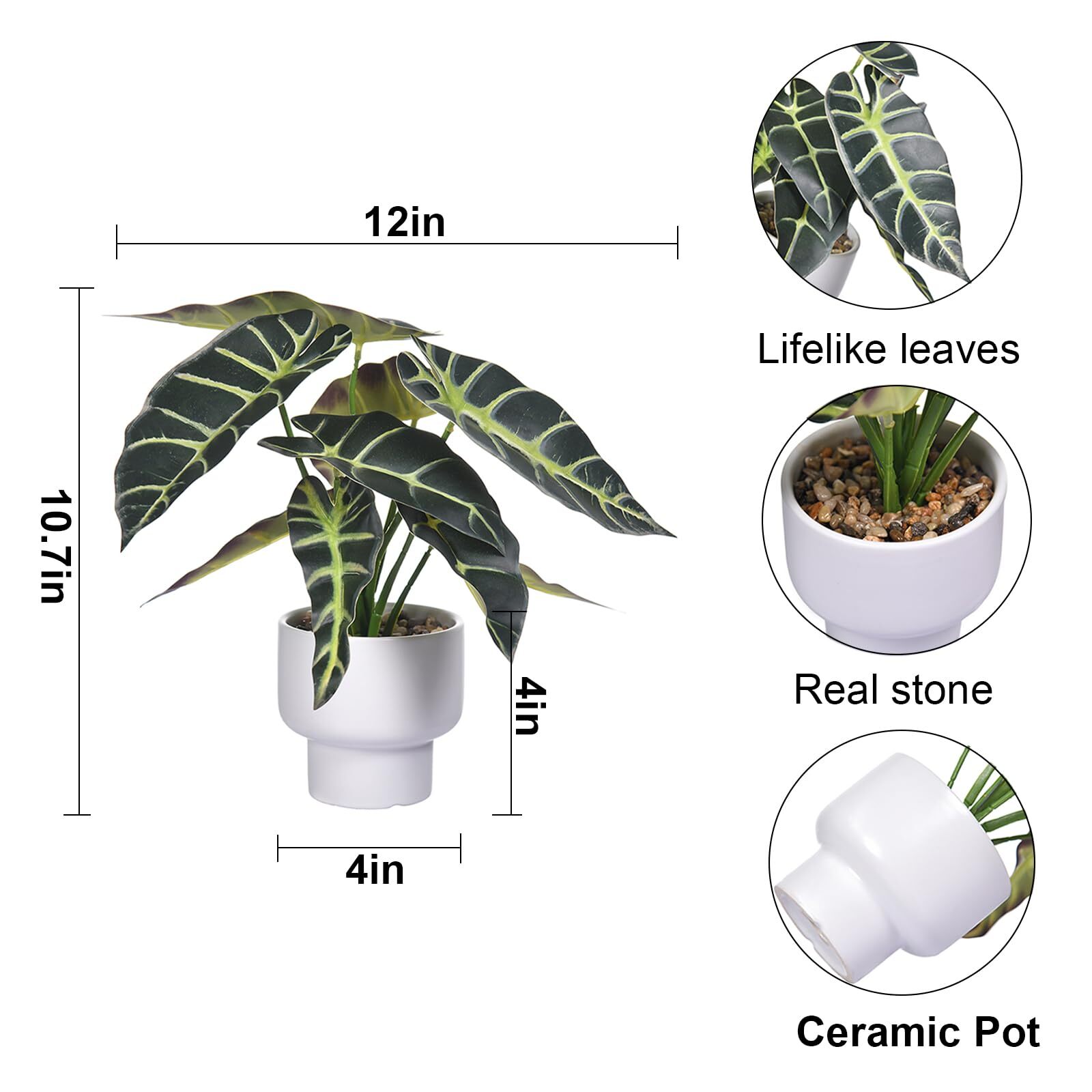 Artificial Plants in Ceramic Pot Fake Potted Plant Faux Alocasia Begonia Calathea Plants for Home Office Bathroom Table Décor Artificial Plants in Ceramic Pot Fake Potted Plant Faux Alocasia Begonia Calathea Plants for Home Office Bathroom Table Décor Product Overview Key Features [Look Realistic & Lifelike]: The leaves and branches are made of high-quality plastic, and the texture of the leaves is delicate and glossy. The dark green leaves and prominent white veins make this plant stand out. These fake plants have a lifelike appearance. [Perfect Size]: Artificial plants measure 10.7“/27cm overall size. Pot width 4"/10cm x height 4"/10cm. This artificial plant has 6 large leaves, including a ceramic pot. Realistic in appearance, it is also an excellent gift for family and friends. [Artificial Tropical Plants]: Fake Alocasia Polly plant are very to natural plants and can easily be considered as living plants. But it doesn't require add water and trim, always neat and clean! No assembly required, can be opened and used, very convenient. This green plant perfect for the all seasons. [Wide range of placement methods]: Green plants are perfect for displaying in homes, offices, fireplaces, farmhouses, dining tables, bookshelves, or any other area that requires green decoration. Simply place it in the position you want, and it will make the environment elegant. [Perfect Decoration]: Artificial Alocasia Polly plant are suitable for both outdoor and indoor use, and you can place them anywhere you want, adding a touch of green vitality to you. They are also excellent gifts for housewarming parties, weddings, and holidays. Return Policy ⦿ You may return the item within 30 days. Contact us via eBay messaging for return instructions. ⦿ We guarantee your satisfaction. Any issues will be resolved promptly. ⦿ Free shipping and returns with a 30-day money-back guarantee. ⦿ Please contact us for the return shipping address. Shipping Information ⦿ We ship to the address provided on eBay. Please ensure it is accurate. ⦿ Standard delivery time is 3-5 business days. ⦿ We use reputable shipping services such as UPS, FedEx, and USPS. ⦿ Currently, we ship only within the 48 contiguous states of the USA. ⦿ For any shipping concerns, feel free to contact us. Customer Support ⦿ For any inquiries, please contact us via eBay messaging. We typically respond within 24 hours. ⦿ Customer satisfaction is our top priority. ⦿ If you encounter any issues, please contact us before leaving feedback, and we will do our best to resolve them. About Us We are committed to providing high-quality products at competitive prices, ensuring that our customers receive the best value. Our team is dedicated to delivering exceptional customer service and a seamless shopping experience. With years of experience in the industry, we have established strong relationships with suppliers, enabling us to offer a diverse range of products. We continuously strive to expand our product selection and improve our services to exceed customer expectations. Our mission is to achieve 100% customer satisfaction by addressing any concerns promptly and effectively. Thank you for choosing our store. We look forward to serving you again and making your shopping experience delightful.