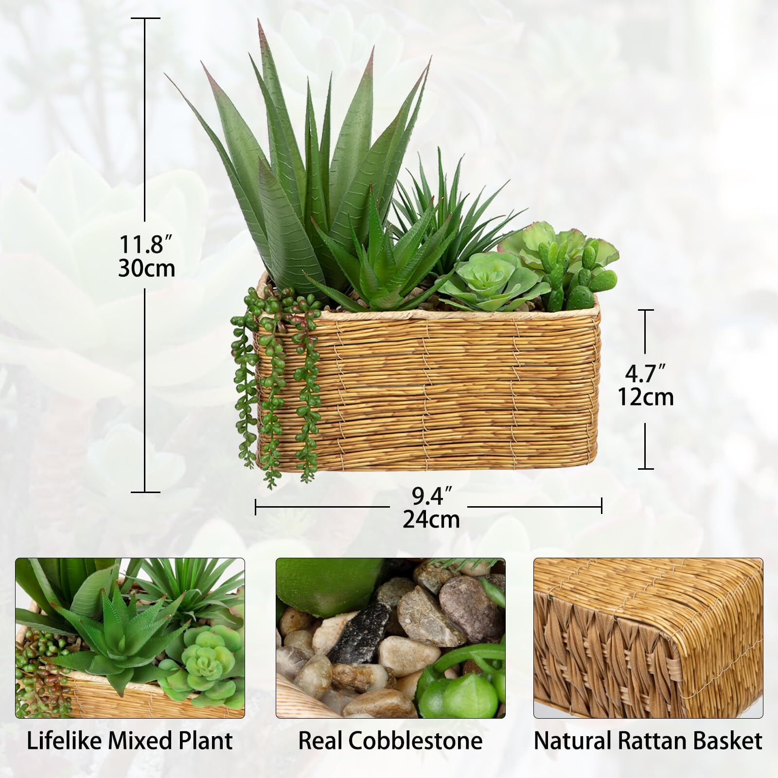 Artificial Succulent Plant Arrangement Centerpiece Assorted Fake Agave Succulents in Rectangular Woven Basket 10" Faux Potted Succulents for Indoor Home Office Table Windowsill Shelf Decor Description and features Eye-Catching Succulents Plant Decor: Succulent artificial plants all styles were originally designed by “”, this design is inspired by the home artistic needs of modern people. Potted succulents snake artificial decor delicate enough to be used as a desktop, window, patio, table decor in your bedroom, living room, bathroom, office, or dorm Premium Material: Artificial succulent plant is a blend of 7PCS faux succulent plants and snake greenery arranged in a woven basket pot. Small fake succulents in pot are made of plastic and pre-potted in natural rattan basket planter with natural pebbles. It's suitable for adding a modern farmhouse style and natural green to your home and office Fake Succulent Size: Faux potted succulent centerpieces plant arrangement measures about 9.4" x 4.5" x 11.8"(LxWxH). The rectangular natural rattan basket planter measures about 9.4" x 4.5" x 4.7"(LxWxH). Please read the dimensions carefully. This faux snake succulent plant looks very realistic and will add a touch of green to any space No Maintenance Required: Lifelike snake agave aloe succulents decor artificial are a practical alternative to living plants. There are have two style for you. The fake succulents in pot require no maintenance or care and can maintain a fresh appearance throughout all seasons, it will add value and beauty to your home Versatile House Plant Decor: The potted fake succulents agave faux plants indoor are widely used to decorate centerpiece table, windowsill, bookshelves, office, kitchen countertop, bedroom, bathroom, and even home garden, adding an elegant rustic atmosphere Artificial Succulent Plant Arrangement Centerpiece Assorted Fake Agave Succulents in Rectangular Woven Basin 10" Faux Potted Succulents for Indoor Home Office Table Windowsill Shelf Decor Return Policy ⦿ All our products come with a 30-Day Return Policy. If you would like to return your item and you are within 30 days of the purchase, and it is still in its original condition, you can return the item by contacting us through eBay messaging. ⦿ If you are not 100% satisfied, please let us know the Detailed Problem,We will give you a 100% satisfactory solution ⦿ If you received an incorrect, damaged, defective, or item not as described, contact us for a partial/full refund or replacement on our cost. ⦿ Free Shipping and Free Return 30-Days Money Back Guarantee. ☎ For all returned products, buyers MUST contact us for the returning address. Shipping ⦿ We do not ship to a different address. we will ship to the address you provide on the ebay only. Please check your address before purchase. ⦿ It should take 2-4 business days for the product to reach your destination. ⦿ If the product doesn't reach your destination within the time limit, please give it an additional 1-2 business days in case of postal delays and/or possible technical issues. ⦿ We use a selection of shipping services such as UPS, FedEx, USPS etc. ⦿ We ship only to the 48 contiguous states of America. We do not ship to Hawaii, Alaska, US Protectorates, APO/FPO addresses. Local pickups are not offered. ☎ If it takes any longer than that, please do not hesitate to contact us to resolve the issues. Contact us ☎ Please contact us via eBay message. And your message will be replied within 1 business days. For any queries, please feel free to contact us, we will get back to you as quickly as possible. Customer 100% satisfaction is our first priority and goal. We are always working hard for maintain high standards of excellence and resolve your problem in best way. So your POSITIVE FEEDBACK is very important. If you have any problem of the item, please feel free to let us know before leaving your feedback. We will try our best to solve your problem. About us We are here to give you quality products, competitive pricing and amazing service in order to make sure you get the best deal online, Thank you for your business and the opportunity to serve you.