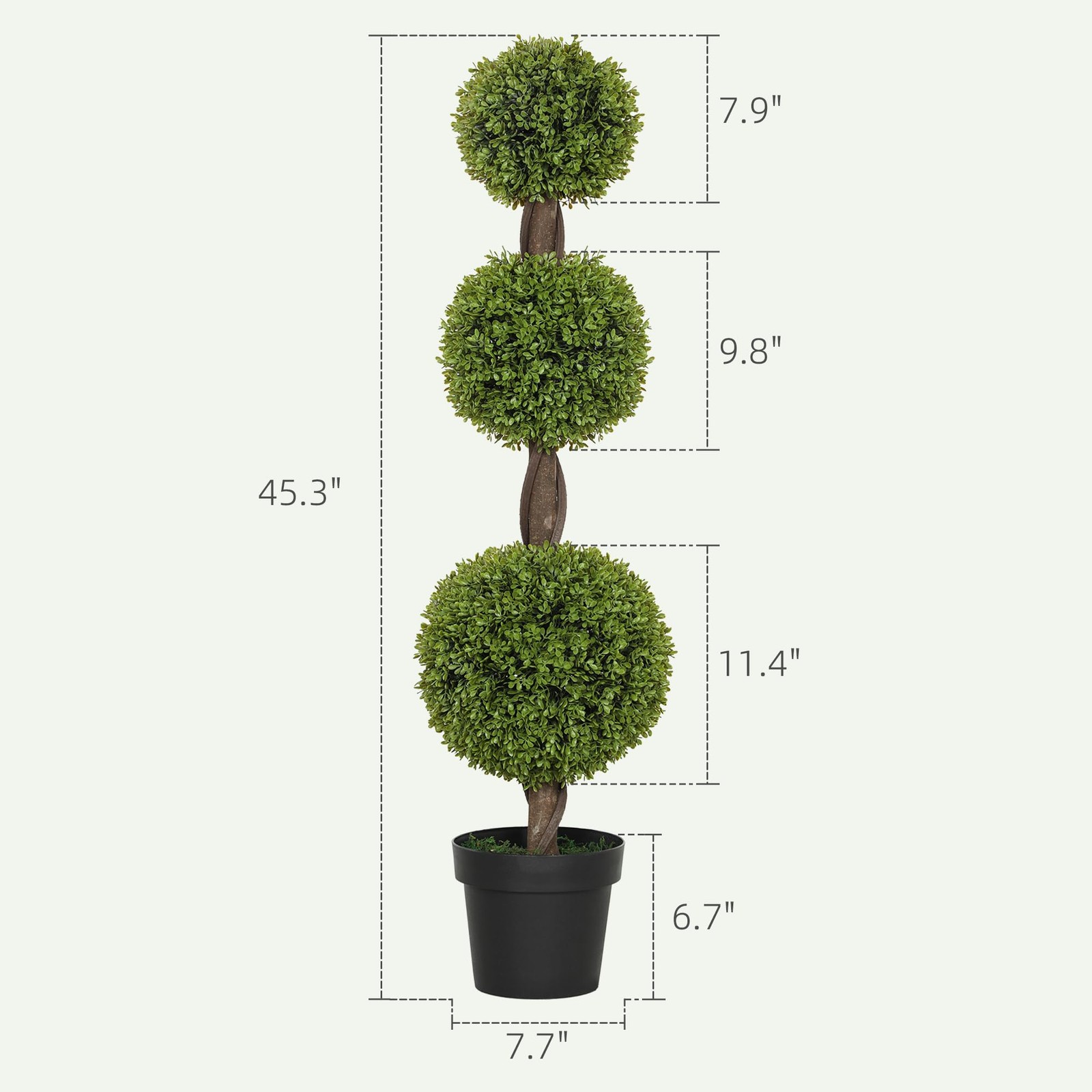 Two-piece Set: This set of two artificial ball-shaped boxwood trees will give any setting an irresistible sense of elegance. Their impressively realistic color and natural texture make the faux plants indistinguishable from the real plants UV Protection Assured: Crafted for versatility, these fake plants are UV-protected, making them great for both indoor and outdoor environments Nursery Pot Included: The potted artificial plants are delivered ready to use and are planted in the pots with faux grass and moss, so you don't need to look for the pots to suit the pieces. Cement soil makes it more stable Easy Maintenance: No need to water and fertilize. Neither will die nor fade sand match everywhere in your home. The faux plants will stay green all year round. Wipe them clean with a damp cloth or duster if the plastic plants get dusty Outdoor Plants Information: Overall Height: 45.3", Ball-Shape Bush Size: 7.9" Dia, 9.8" Dia, 11.4" Dia. Pot Size: 7.7" Dia x 6.7" H. Assembly not required