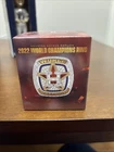 Astros memorabilia lot including 2022 World Series ring replica (Chas McCormick), Justin Verlander 2019 Cy Young bobblehead, and Framber Valdez 2022 Quality Start bobblehead. All packages are unopened and in original packaging.