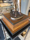 This was a trophy. Sculpture is mounted on a 3.5 inch tall, two tiered base that has a 9x9 stand and 11x11 base.