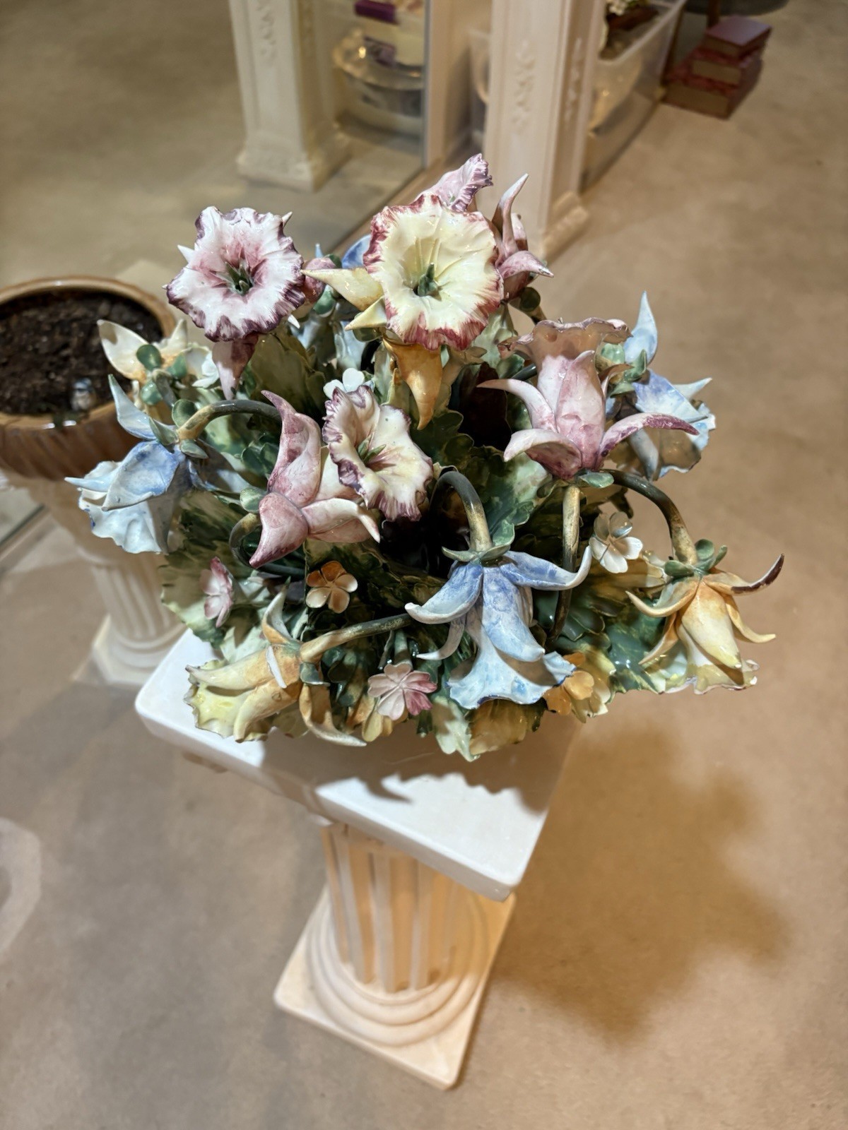 This authentic Capodimonte Porcelain Floral Centerpiece is a vintage piece made in Italy. The hand-painted multicolor floral design, featuring a rose subject, is a beautiful addition to any room. Signed by the Capodimonte brand, this original art pottery piece from the 1950s showcases intricate details and a glossy finish. With its European origin and traditional production techniques, this centerpiece exudes elegance and charm. This item Originates from Napoli Italy and is a genuine collectible. Please feel free to reach out with any questions you may have