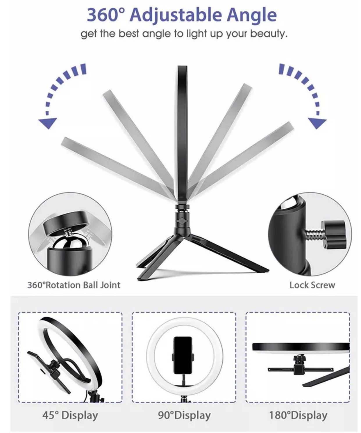 LED 10" Ring Light with Stand:Compare to other ring lights, this 10.2" ring light with 120pcs bulbs is more powerful, giving you an outstanding look when doing makeup, live streaming, YouTube video, vlog, selfie and video chat, etc. 3 Light Modes &11 Brightness Levels: This 10.2" dimmable led ring light has 3 lighting modes: warm, natural and cold, color temperature: 2300K-6000K. Each lighting mode has 11 adjustable brightness to choose. You can adjust the modes and brightness to meet your needs for every occasion. 360° Rotatable Ring Light & Universal Phone Holder: LED ring light with stand, you can adjust the angle to 45°, 90° or 180° according to your needs. Phone holder 360° rotatable, vertically or horizontally and suitable for iPhone or Android. Wireless Remote Control & USB Powered: You can take photos and shoot videos wirelessly with the remote. This light works with most devices that support USB ports, like USB chargers, laptops, pc, power bank, etc. Easy Operation: The controller allows you to change the light modes and levels of brightness. You can also combine the stand as compact desktop makeup ring light.