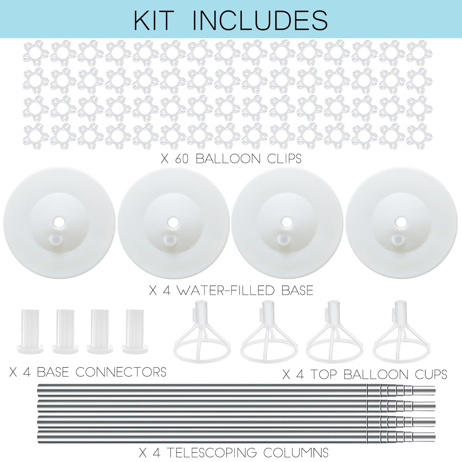 Balloon Column Kit Set of 2 CREATE STUNNING DECORATIONS: Make your parties unforgettable with this balloon stand kit that includes 4 telescopic metal stick,4 top balloon holder,60 Balloon rings,4 water/sand fillable bases. (Balloons not included) QUICK AND EASY ASSEMBLY: No more struggling with complicated balloon tower stands. With this kit, you can assemble balloon towers in just a few minutes. CUSTOMIZABLE HEIGHT: The telescopic design allows you to adjust the height of the balloon column stand from 20” to 80”, making it perfect for any occasion. DURABLE AND STABLE: Made with high-quality PVC and stainless metal, this balloon stand kit is sturdy and won't break easily. We've also improved the thickness of the telescopic metal stick to make it more durable and less likely to deform. VERSATILE DECORATION: Perfect for birthdays, weddings, graduations, baby showers, gender reveal parties, Christmas, and more. Make your events unique with this balloon stand kit.