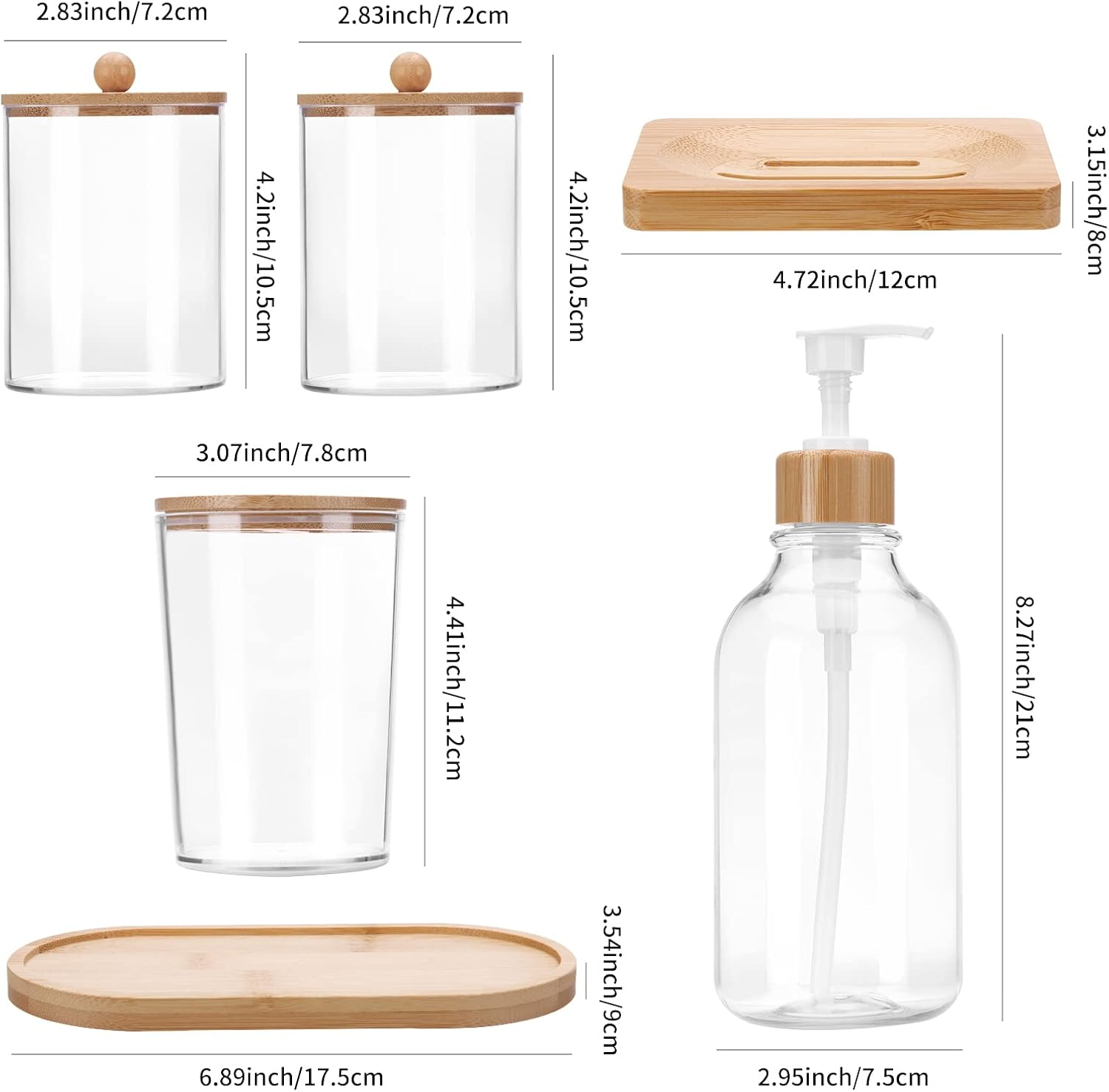 Store New Arrivals Add to Favorite View Feedback Contact Bathroom Soap Dispenser Set, Bamboo Bathroom Accessories Set of 6, Toothbrush Holder, Soap Dispenser, Soap Dish, Tray and 2 Plastic Qtip Jars with Bamboo Lid Description Item model number A428 Style Bamboo-A Batteries required No Fabric Type Bamboo Material Plastic, Bamboo Country of Origin China Package Dimensions 8.98 x 6.46 x 4.21 inches Item Weight 1.17 pounds Color Brown Finish types matte Number of Pieces 6 Finish Type matte Included Components Dispenser, Soap Dish Bamboo Bathroom Accessories Set: This set contains a toothbrush holder, a soap dispenser, a soap dish, a tray and two plastic Qtip jars with bamboo lids. Appealing and Safe: The jar is made of plastic, BPA-free, and more drop-resistant compared to glass. The cover is made of bamboo, waterproof and dustproof. The handle of the lid is designed with a round bead for ergonomics and aesthetics. Sustained and storable: The plastic makes our suits less prone to breakage and can last longer. And each one can be adapted to your home, giving you more storage space. Elegant home accessories: Boho bathroom sets are desirable accessories for home decorating bathrooms. Delicate jars and bamboo form a very natural decorative element, suitable for bedrooms, bathroom vanities, dressing tables, kitchens, offices, etc. Exquisite gift: Suitable gift for any occasion, our 6-piece set is practical and beautiful, making a great gift for family, friends, colleagues, weddings, housewarmings and anniversaries. Product Description Package include: A toothbrush holder, a soap dispenser, a soap dish, a tray and two plastic qtips. Great material: The bathroom accessories set is made of thick shatterproof plastic, the plastic material makes them more durable and not easy to break. Special Design: The anti-slip mat can well prevent the tray and soap box from moving, making them stay where they should stay more safely and stably. ABOUT US We offer the best prices around on high quality products. Our E-store includes media such as books, movies, music and games while offering electronics, toys, sporting apparel, clothing, tools, general home, garden items and more. FREE & FAST SHIPPING We are always working hard to ensure your package arrives as soon as possible. Please understand that some factors like weather, high postal traffic, and the performance of shipping companies are outside of our control. We offer free shipping to the lower 48 states and ship within 2 business days of payment, usually sooner. We do not accept P.O. Boxes. Please provide a physical address. RETURNS We offer a 30-Day Return Policy on items which you are not completely satisfied with. You have the option for a full-refund or an exchange of the item. No returns are available on items shipped outside of the USA. PAYMENT We accept PayPal. CONTACT US This page content is yet to come Please ad us to your favorite seller and visit again later Thank You CUSTOMER SATISFACTION We try our very best to make sure every customer is completely satisfied. If there's a problem, message us! We're happy to help.