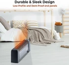 POWERFUL HEATING PERFORMANCE: Designed for medium-sized rooms, this convection heater packs plenty of power to keep you cozy and warm. With its 1500-watt heating element, it efficiently delivers warmth to your space. You can choose between two heat settings to customize your comfort level, ensuring the perfect amount of heat for any situation. The digital adjustable thermostat with a clear temperature display allows you to easily set and maintain your desired temperature. Experience reliable and precise heating performance. WHISPER-QUIET OPERATION: Experience the comfort of a quiet environment with this electric baseboard heater. Designed for silent operation, it ensures that you can enjoy your activities without any distracting noise. Whether you're watching TV, listening to music, or engaging in a conversation, this heater won't disrupt your moments of relaxation. With its noise-free performance, you can create a peaceful and serene atmosphere in your room, while still enjoying the warmth it provides. Say goodbye to loud and intrusive heating systems. ENHANCED SAFETY FEATURES: Rest easy knowing that this heater is equipped with an advanced safety system. It includes a safety tip-over switch that automatically shuts off the heater if it accidentally topples over, preventing any potential hazards. The stay-cool body ensures that the exterior remains cool to the touch, even during operation, reducing the risk of burns. The overheat protection sensor actively monitors the temperature to prevent overheating, providing you with peace of mind while using the heater. DURABLE AND SLEEK DESIGN: This low-profile convection baseboard heater features dent-proof end panels, ensuring its long-lasting durability and maintaining its sleek appearance even with regular use. You can rely on its sturdy construction to withstand the test of time without worrying about it getting dented or looking worn out. Enjoy the reliable heating performance while keeping your space looking polished and well-maintained. ENERGY-EFFICIENT HEATING SOLUTION: Optimize your home heating costs with an electric baseboard heater equipped with a thermostat. By delivering targeted heat to the specific room you're in, this heater allows you to focus on comfort where you need it most, without wasting energy on heating the entire house. Enjoy efficient and cost-effective heating while maintaining a cozy environment in your chosen space. Power 1500 Watt Heater There's plenty of power in this digital baseboard heater thanks to its 1500 Watts, so you can rest assured that you'll warm up in no time. The convection heater features two heat settings and a digital adjustable thermostat with temperature display, so you'll have the level of control you need for the precise temperature you want. Silent Operation in a Stylish Design The electric baseboard heater delivers silent operation to ensure that no one is disturbed. Read a book, watch TV or chat without being distracted by irritating background noise. The low-profile black heater features dent-proof end panels for durability, so the unit will look stylish for years to come. Safety First An advanced safety system provides added peace of mind, especially if you have pets or children in the home. The system includes a safety tip-over switch that cuts power if your heater is accidentally knocked over, a stay-cool body and an overheat protection sensor that prevents it from getting too hot. Reduces Heating Costs If you're looking for a way to save on home heating bills, look no further than this electric baseboard heater with thermostat. It allows you to keep the room you're in at a warm and comfortable level while lowering the heat in the rest of your home, particularly in unused areas.