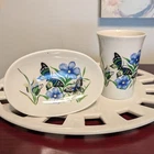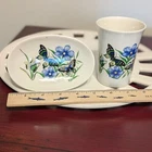 New In Box Bathroom Tumbler Brush Holder & Soap Dish Flowers Butterflies VTG NOS. New in a vintage box and unused. Opened to photograph the pieces. Pretty scene with blue flowers and butterflies.