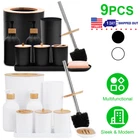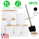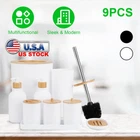 9Pcs Bathroom Accessories Set Trash Can Lotion Soap Dispensers Q-tip Holders Toothbrush Holder Soap Dish Vanity Tray Toilet Brush Black White Featured Item Product Detail Image Gallery Product Description Overview: Looking for a complete bathroom set? Package includes 2 Q-tip holders, 2 lotion soap dispensers, 1 soap dish, 1 trash can, 1 toothbrush holder, 1 vanity tray and 1 toilet brush with holder, 9 pieces in total, covering all your basic needs. A perfect way to organize your bathroom space and add a touch of style. Choose from black or white and enjoy a clutter-free, elegant bathroom. Upgrade your bathroom today! Features: Complete Bathroom Accessories Sets: The 9 pieces guest bathroom essentials include 2 Q-tip holders,2 lotion soap dispensers,1 soap dish,1 trash can,1 toothbrush holder,1 vanity tray and 1 toilet brush with holder,covering all your basic needs. Sleek & Modern: Made from premium plastic & bamboo and paired with classic color(black/white),these bathroom sets accessories are built to last for a long time and complement your bathroom decor. Multifunctional Vanity Tray & Toilet Brush: The bathroom accessory set offers a vanity tray for you to organize your razors,toothbrushes,cosmetics and other small objects or place candles,flowers and other decorations. The toilet brush is easy to assemble,just screw the poles & the lid,and store it in the provided holder. Portable & Convenient: The 6L/203Oz trash can keeps the bathroom clean and hygiene. The 2Pcs 500ml/17Oz dispensers and 1pc soap dish provide easy access to your favorite lotion and soap products. The 350ml/12Oz Q-tip holders(2pcs) and toothbrush holder(1pc) offers practical storage solutions for your bathroom essentials. Wide Usages: This bathroom kit is widely used in the bathroom,guest room,office,hotel,RV,small apartment,dormitory etc.. Specifications: Brand: Newhome Product Type: Bathroom Accessory Set Color Options: Black, White Material: Plastic+Bamboo Trash Can: Toothbrush Holder: Per Lotion Soap Dispenser: Per Q-tip Holder: Vanity Tray: Soap Dish: Toilet Brush Holder: Toilet Brush Length: 33cm/13in Package Size: 28*20*20cm/11.02*7.87*7.87in Package Weight: 1238g/2.72lbs Package Contents: 2 x Q-tip Holders 2 x Lotion Soap Dispensers 1 x Soap Dish 1 x Trash Can 1 x Toothbrush Holder 1 x Vanity Tray 1 x Toilet Brush with Holder Terms & Conditions Thank you for your business !