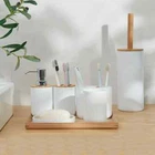 Bathroom Accessories Set Soap Dispenser Bottle Dish Washroom Toothbrush Holder Cup Suit Lotion Rack Toilet Brush Garbage Can Gallery Description Bathroom Accessories Set Soap Dispenser Bottle Dish Washroom Toothbrush Holder Cup Suit Lotion Rack Toilet Brush Garbage Can 1pc Soap Lotion Dispenser Bathroom Accessories Set Resin Wood Soap Dish Toothbrush Holder Tumbler Pump Bottle Cup Black or White Features: 100%Brand new and high quality. Bamboo trash can:The ingenious design makes it a highlight of the table corner/wall corner.The beauty of life starts with details, simple design and meticulous workmanship. Toilet Brush with holder:Function and beauty coexist, can decorate the toilet brush in the bathroom.The brush handle is made of stainless steel, which is not rusty and durable.With self-locking non-slip wire to prevent the brush head from falling off during use, high-quality brush head. Lotion bottle:Simple and practical lotion bottle, enhance taste/improve messy bathroom.Double-layer electroplating nozzle, pressing with one hand, feel smooth.It has a smooth feel, no rust, no blackening, fine workmanship, and durability. Soap Box:Bamboo wood feel/minimalist design, small and flexible, suitable for a variety of soap types.The rounded corners are processed around, so it will not cut hands and is easy to take.Ultra-thin and practical, it does not take up space while still being strong and durable. Toothbrush Cup:Fashion and elegance coexist, experience the refreshing feeling of washing in the morning and evening.Partition interval, non-slip design, easy to hold.In line with modern practical design, using environmentally friendly materials, use with confidence. Mouth cup:Beginning with appearance/final quality, long-term companionship, more durable without fear of falling.Frosted feel, more slip resistant, and comfortable to hold.Each cup mouth is carefully polished to make it smooth and not hurt the lips. Application: table corners or wall corners in office homes, restaurants, clubs, tea houses and other places. Specifications: Material: PP+Bamboo Color:Black,White Size: As the picture shows Package Includes: 1 x Trash can 1 x Toilet Brush with holder 1 x Lotion bottle 1 x Toothbrush Cup 1 x Soap Box 1 x Mouth cup Shipping Free Worldwide Shipping! Payment Policy Safe and secure payment with PayPal! Return Policy 30 Days returns!