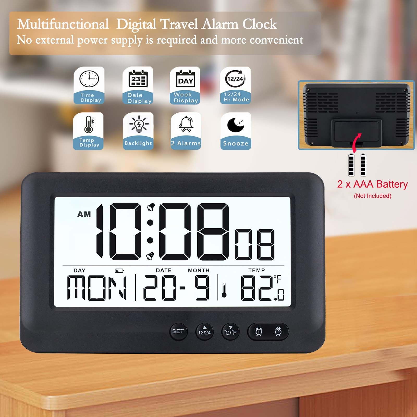 Digital Alarm Clock – Multifunctional Size: 143 x 30 x 87mm LCD Size: 110 x 53 mm Battery: 2 x AAA (batteries not included) Key Features: Comprehensive Display: The battery operated digital clock features a easy-to-read LCD screen that shows the time, date, day of the week, and indoor temperature. This multifunctional display provides all the essential information you need at a glance. Multi-Language Day Display: The digital clocks for bedrooms offers weekday display options in seven languages: English, German, French, Dutch, Italian, Spanish, and Danish. This makes it versatile for users in different regions, ensuring that your simple alarm clock is both practical and easy to understand. 12/24 Hour Format and Temperature Unit Options: Choose between a 12-hour or 24-hour time format based on your preference. The battery alarm clocks for bedrooms also lets you select between Fahrenheit or Celsius for temperature display, supporting a range of -9.9°C to 50.0°C for accurate readings. Dual Alarm Function with Independent Control: Set two separate alarms with independent on/off controls, making the battery powered alarm clock ideal for people with different wake-up schedules or for setting a backup alarm. The small desk clock can be adjusted individually without any hassle. Snooze Function with 5-Minute Interval: If you need a few extra minutes of sleep, simply touch the snooze button. The digital desk clock provides a 5-minute snooze interval, allowing you to rest without worrying about missing your wake-up time. Low Battery Indicator: The battery digital clock features a low battery indicator, which displays a symbol when the battery level is low. This ensures you can replace the batteries in time before the mini digital clock stops functioning. World Time Zone Adjustment: This alarm clocks for bedrooms battery operated includes a world time zone setting with a -12/+12 hour offset, allowing you to adjust it to your local time zone or any other region, making it perfect for travelers or users in different time zones. 【Portable & Battery-Powered】The battery operated digital clock can be placed anywhere without a plug. This simple alarm clock’s compact size makes it easy to move and ideal for travel as a travel alarm clock, or for use as a small desk clock,bedside alarm clock,bedroom clock,small clocks for shelf , offering convenience wherever you go. 【Simple Style& Easy to Use】This battery operated digital clock has clearly marked front-facing buttons, allowing you to set alarms and adjust settings with ease. The simple alarm clock’s user-friendly design ensures quick and simple operation for daily use. 【Wide-angle Display&Multifunctional】Width: 5.6 inches. Height: 3.4 inches,The Length of The Alarm Clock Is Similar to That of A Phone, and Its Width Is About 0.4 Inch Wider than A Phone. Featuring a 170°wide-angle LCD screen ,the display ensures you can view all essential information from different angles.This battery powered alarm clock shows the time, weekday, date, and temperature simultaneously. 【5 Seconds Backlight & 5-Mins Snooze】The small desk clock features a 5S backlight function that allows you to easily view the time in low light conditions.The backlight turns off automatically after 5 seconds—it doesn't stay on, which which is very friendly to your sleep.Simply touch the snooze button the battery digital clock provides a 5-minute snooze interval, without worrying about missing your wake-up time. 【Dual Alarm Clock with Independent Controls】The battery digital clock sets two separate alarms with individual switches, eliminating the need for complicated setups. Perfect for different schedules, each alarm can be turned on or off independently, offering flexibility for both workdays and weekends. 【Premium Build & Durable Design】Crafted from high-quality resin with a matte finish, this digital clocks for bedrooms is built to last.The battery digital clock’s sleek design fits seamlessly into any room, from bedrooms to offices, and provides a tactile, durable user experience.