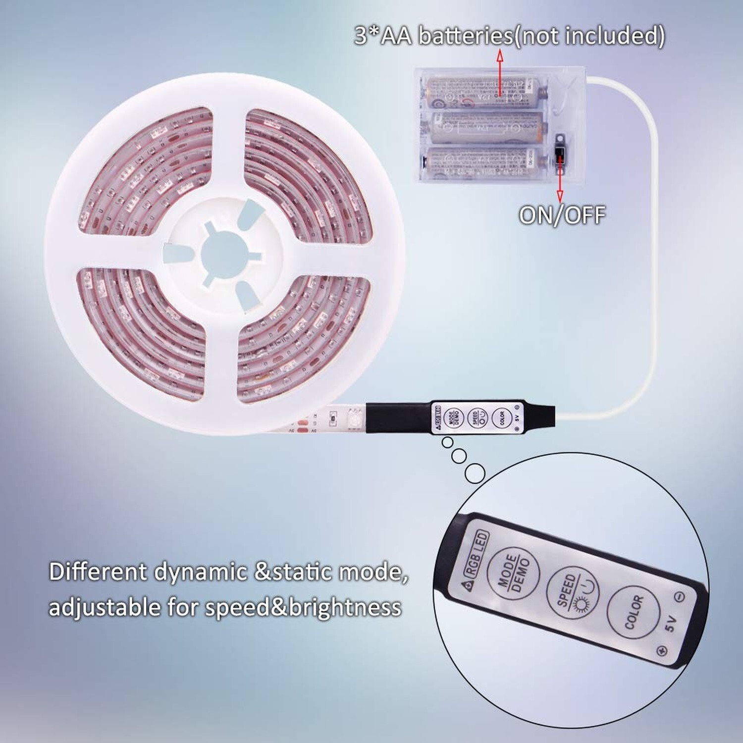 Led Strip Lights Battery Powered, RGB Led Lights Strip Battery Operated 3 Keys Controller Battery Led Lights Strip Waterproof Color Changing Led Lights TV DIY LED Tape Lights 6.56ft 2Pack ✓ Free 60 Day Returns ✓ Free Express Shipping Description: Features: 3KEYS CONTROLLER: Battery led strip lights control by 3 buttons on the connector, extreme easy to operate: MODE for 20 dynamic mode switching, COLOR for 20 color switching. The middle button SPEED for speed adjusting under dynamic mode and brightness adjusting under static mode, flexible and smoothly. BATTERY POWERED: LED strip lights powered by 3pcs AA batteries(NOT INCLUDE), portable to anywhere and a great idea for any DIY. Sincerely suggest using the high quality batteries, that is will not damage the led strip lights also with longer life time.Any issue while using, please contact us in time,we will offer the reasonable solution in the first time. IP65 WATERPROOF: Battery powered led strip lights cover with high quality silicone, waterproof even immersed in water(not include the part of battery pack), also the silicone protect the leds well at the same time it is safe to touch. FLEXIBLE & EASY TO INSTALL: Flexible led strip lights can be cut for every 1 led to fit the length you desired. And The super viscosity adhesive can be stick any flat, only turn on the switch back of the battery pack, then you can enjoy the colorful lights. MULTI PURPOSE: Led battery strip lights is great idea for any DIY, aircraft, and holiday and party decoration. Product Details: Color: RGB (Red, Green, Blue) Brand: abtong Indoor/Outdoor Usage: Outdoor Special Feature: Waterproof Light Source Type: LED Power Source: Battery Powered Theme: Tv Occasion: Christmas Style: 现代 Material: Vinyl, Metal Package Dimensions : 8.07 x 6.54 x 1.26 inches; 8.47 ounces Item model number : BPT-3K-2P Date First Available : August 27, 2019 Manufacturer : abtong Country of Origin : China Customer Reviews: 4.2 4.2 out of 5 stars 1,260 ratings Color: RGB (Red, Green, Blue) Brand: abtong Indoor/Outdoor Usage: Outdoor Special Feature: Waterproof Light Source Type: LED Power Source: Battery Powered Theme: Tv Occasion: Christmas Style: 现代 Material: Vinyl, Metal Controller Type: button Number of Light Sources: 180 Voltage: 5 Volts Bulb Shape Size: T5 1/2 Wattage: 3.00 Included Components: 'Led strip light', 'Battery power box', 'manual' Number of Items: 2 Control Method: Remote Water Resistance Level: Waterproof Manufacturer: abtong Part Number: BPT-3K-2P Item Weight: 8.4 ounces Package Dimensions: 8.07 x 6.54 x 1.26 inches Country of Origin: China Item model number: BPT-3K-2P Special Features: Waterproof Batteries Included?: No Batteries Required?: No Date First Available: August 27, 2019