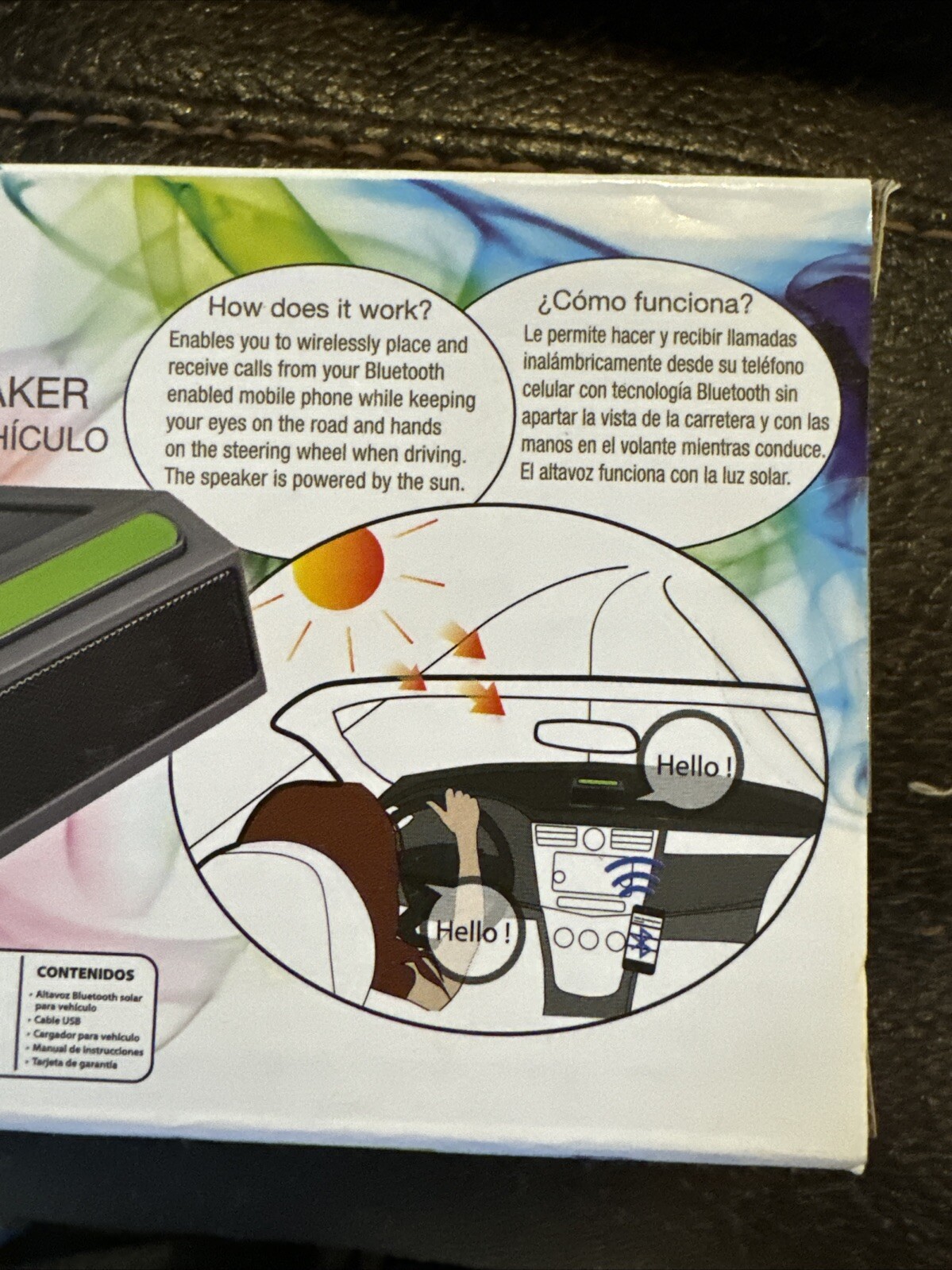 This is a new Bauhn Go solar Bluetooth car speaker. It features a solar panel that allows you to charge the speaker using solar energy. The speaker is designed to be portable and easy to use, making it perfect for outdoor activities or travel. With its Bluetooth connectivity, you can easily connect the speaker to your device and enjoy your favorite music on the go. The speaker also includes a variety of features, such as a built-in microphone and hands-free calling, that make it a versatile and convenient accessory for any driver.