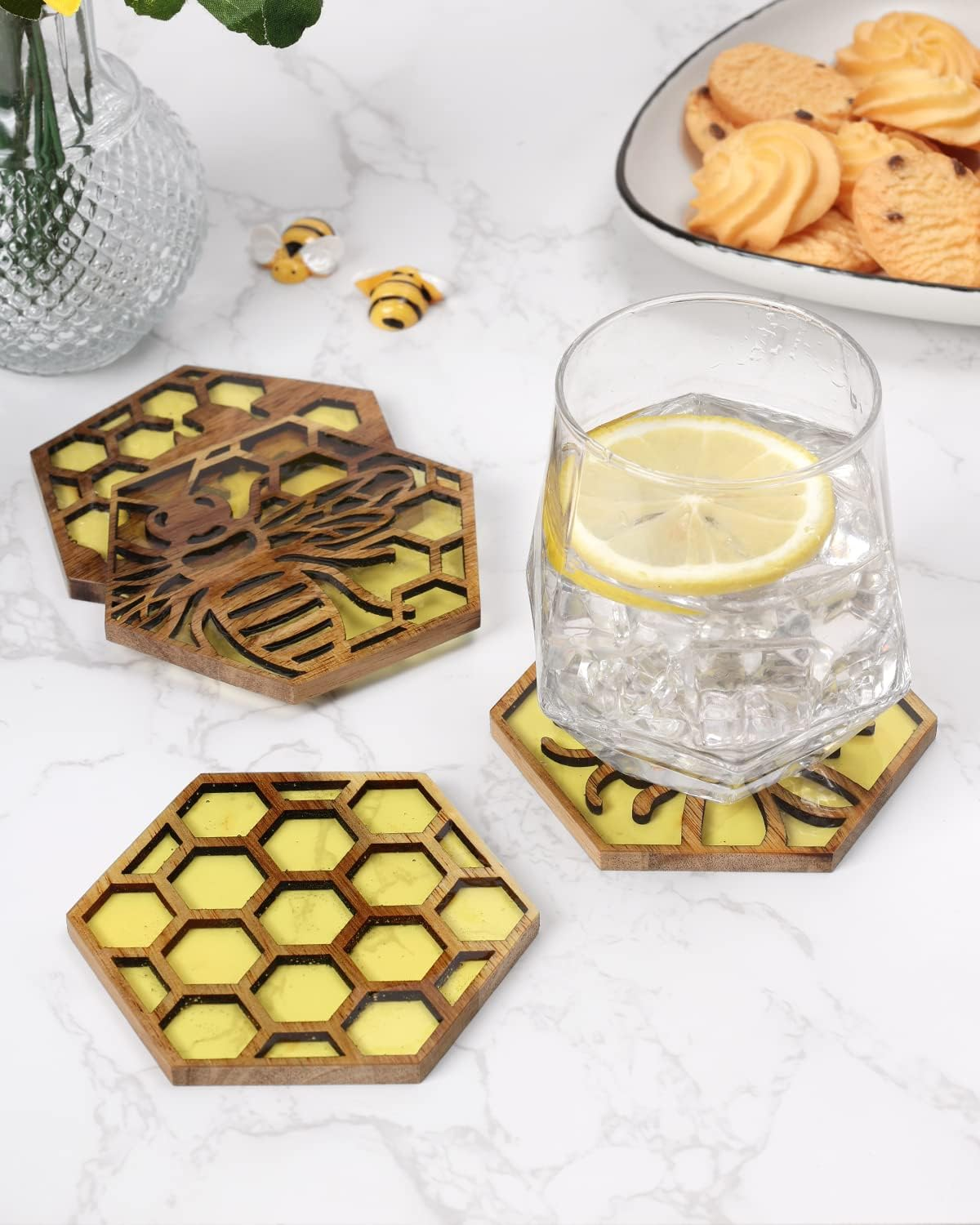 Bee Resin Wood Coaster Set of 6 Honeycomb Wooden Epoxy Resin Drink Coasters for Cold Drinks Wine Glasses Beverage Mugs Bee Themed Cup Mats for Kitchen Dining Coffe Table Gift for Her/Him Unique Honeycomb Bee Coaster - You will receive 6pcs bee resin wood hexagonal coasters in 6 different styles. Design with a honeycomb and bee engraved pattern cut into the wood and filled with yellow resin giving a fantastic look to the coasters. Resin-filled Handicrafts - Each piece is laser cut and filled with colored epoxy resin that resembles real honey. Resin-filled coasters will take several additional days to fully cure. Then we manually polish and seal each coaster, striving to make a quality cup mat that will please you. Handmade with Care - Made of quality acacia wood. Due to every piece of solid wood having its own unique grain and tone, it is possible your coasters may look slightly different from the one shown. As each piece is handmade and filled, there are a few bubbles and dyeing. Keep Your Tabletop Clean - Each coaster is about 3.9" wide by 3.3" tall with 0.6" thickness. They are sturdy, durable, and cold/heat-resistant enough for any table surface. Enjoy your favorite drink while keeping the table dry and free of spills. Bee Kitchen Gifts - Perfect gift idea for any occasion such as Housewarming, Wedding, Graduation, Birthday, Mother's Day, Father's Day, or Christmas. Cut with the honeycomb or honeybee shape to allow light to pass through the resin, creating some amazing results. Product Description Item Thickness 6 Millimeters Number of Items 6 Color Yellow Material vinyl, fabric, glass, wood, Resin Is Dishwasher Safe No Item Weight 11.3 ounces Shape Hexagonal Product Dimensions 3.9"L x 3.9"W Product Care Instructions Hand Wash Only 3.9 "w x 3.9 "w. Weight: 11.3 oz Shipping from the USA All of our products are shipped from the USA, ensuring quick delivery to your destination. Payment We offer the following payment methods: PayPal, credit card, bank transfer, and eBay's secure payment system. Free Shipping & Free Returns Shipping within the USA is FREE. Additionally, any return is absolutely free for you. Risk-Free Purchase You have the option to return an item within 30 days without any justification. We cover the return shipping costs! Fast Shipping We ship immediately upon receipt of payment. Generally, the package is delivered within 2-3 days in the USA. If it takes longer, we will contact you. Quality and Costs Made in Europe, USA, China No customs fees or additional charges Total satisfaction guarantee Invoice with declared VAT available upon request in .pdf format Feedback Your feedback is very important to us. After you pay for your purchase, you will automatically receive positive feedback from us.