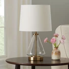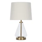 Add light and style to your room with the Better Homes & Gardens Glass with Brass Base Table Lamp. Perfect for living rooms, family rooms, dens, bedrooms, guest rooms, offices, dorm rooms, and more, this elegant lamp has a distinct look that works with almost any decor. Designed with a clear glass cone base and brass accents, this lamp stands 18" for illuminating moderately sized rooms and can be used with coordinating standing lamps for a complete look. The Glass with Brass Base Table Lamp comes with a sleek fabric lamp shade to softly diffuse the light from Type A bulbs as well as energy-efficient CFL and LED bulbs (not included). On Feb 14, 2025 at 21:09:12 PST, seller added the following information: