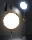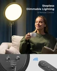 Powerful & Bright Illumination: Equipped with 144 high-definition LED beads and 26W of power, this big ring light provides 5x the brightness of traditional ring lights, ensuring soft yet bright illumination for all your photography needs. Includes an adapter for stable power supply and even lighting. Stepless Dimming Lighting: With a rear knob and digital display, this ring light allows stepless adjustments for precise brightness (0-100%) and color temperature (3000K-6500K). Designed with multiple cooling holes for safe usage, it’s perfect for content creators and professionals. Durable Aluminum Alloy Stand: This ring light with stand features a sleek, sturdy aluminum design and a heavy-duty 11-inch round base, offering space-saving stability. Strong enough to hold your ring light and smartphone, it's more compact than typical tripod ring lights. Height & Angle Adjustable: The stand is extendable from 34 to 79 inches, while the 360° rotating phone holder fits devices wide from 2.66-5.66 inches and the video light head tilts 180°. It’s a ideal lighting kit for barbers, craft artists, live streamers, and influencers. Convenient Remote Controls: The small Bluetooth remote in the large ring light kit works up to 10 feet away, compatible with iOS and Android phones for hands-free photos and videos. The ringlight remote adjusts brightness and color temperature (0-100%, 3000K-6500K) from a distance. Versatile & Wide Compatibility: Designed for content creators, big lighting stand kit provides bright, professional lighting for photography, video recording, live streaming, hairstylist lighting, and Zoom meetings. A reliable, versatile solution for all creative projects.