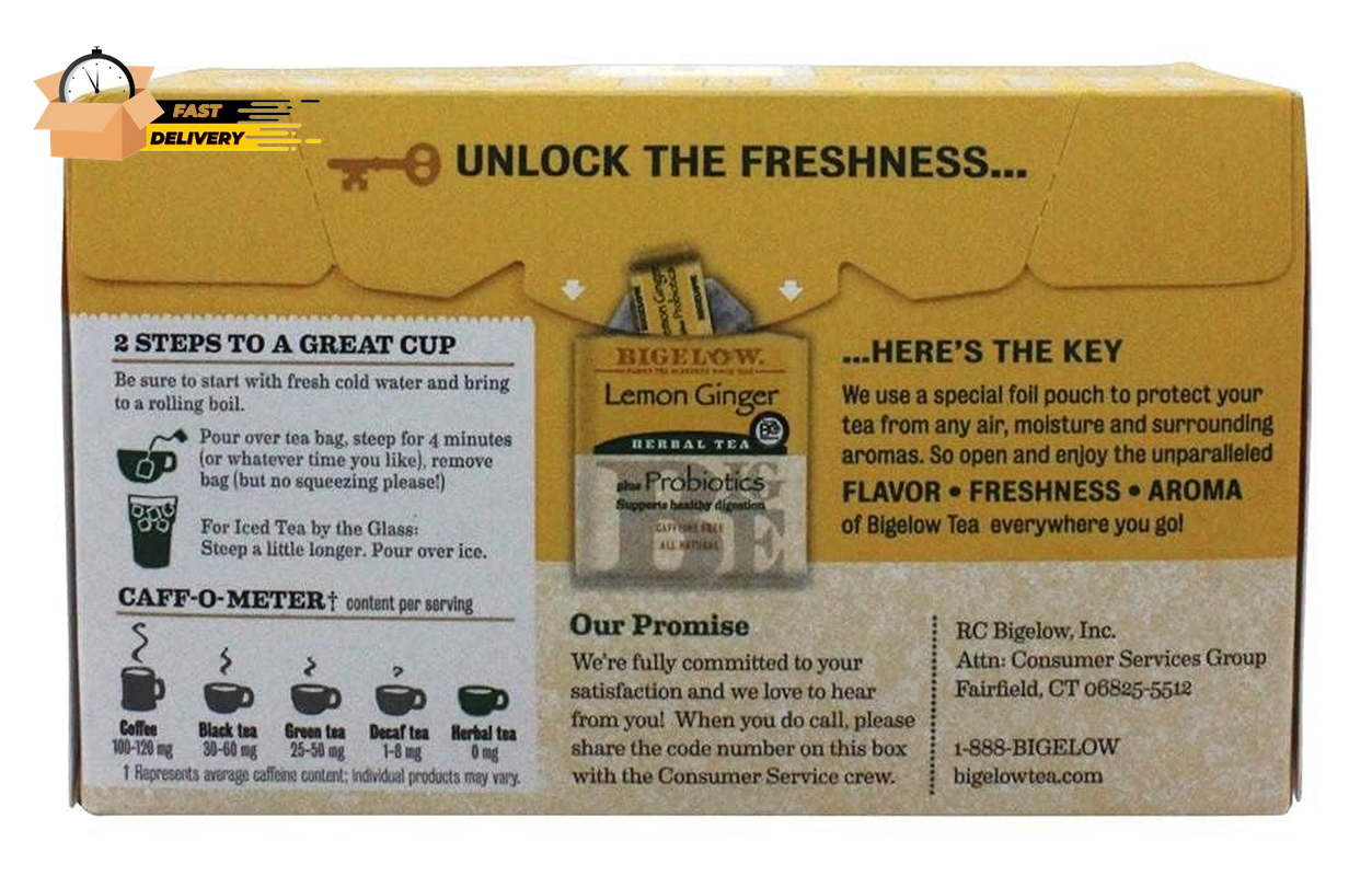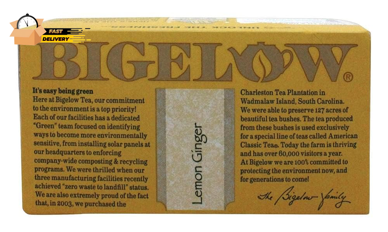 Store New Arrivals Add to Favorite View Feedback Contact Bigelow Lemon Ginger plus Probiotics Herbal Tea Bags, 18 Count Box (Pack of 1) Description Item model number 00232089 Unit Count 18 Count Tea Variety Ginger Product Dimensions 5.2 x 2.75 x 3.15 inches; 1.31 ounces Size 18 Count (Pack of 1) Flavor Name Ginger Lemon Flavor Ginger Lemon Is Discontinued By Manufacturer No Item Form Bag Delicious Probiotic Tea: Our zesty blend of lemon and ginger has been combined with the probiotic BC 30, an innovation that helps maintain a healthy balance. Drink hot or iced Individually Wrapped: Bigelow Tea always come individually wrapped in foil pouches for peak flavor, freshness and aroma to enjoy everywhere you go. Gluten-free, calorie-free, and Kosher Certified Try Every Flavor: There's a tea for morning, noon, and night time relaxation. Try our English Breakfast, Vanilla Chai, antioxidant Green Tea, decaffeinated teas, organic teas and a variety of our herbal tea bags Blended and Packaged in the USA: In 1945 Ruth Campbell Bigelow created our first tea, Constant Comment, a strong, flavorful black tea blended with aromatic orange peel and sweet warming spices. Today, Bigelow is still 100% Family Owned Uncompromised Quality: Since 1945, Bigelow Tea has been a leader in premium tea and proud to be a Certified B Corporation - meeting the highest verified standards of social and environmental performance, transparency and accountability Product Description This recipe not only taste delicious, it's good for your digestion too. Our zesty blend of lemon and ginger has been combined with the probiotic BC 30, an innovation that helps maintain a healthy balance in your digestive tract when used as part of a balanced diet. About the Brand The Bigelow Tea Story Beginning the moment our founder, Ruth Campbell Bigelow created "Constant Comment" Tea in her kitchen in 1945, our family has focused on just one thing trying to make the finest teas possible. Over the years we have introduced many new flavors as well as concepts in tea. Today we offer a selection of deliciously different blends of teas and green teas, a wide variety of herbal teas and teas flavored with real fruit juice. Today Bigelow Tea is the number one specialty tea company in the United States. And to think it all began with the first legendary black tea flavored with golden orange rind and sweet spice "Constant Comment"Tea. Bigelow takes immense pride in providing the tea drinking community with the best tea at a great value. We only use hand- picked teas, real spices, flavors and herbs. The flavors and blends we have created are second to none. Some of our teas contain up to twenty different ingredients! And because tea is a leaf that can dry out we take steps to protect it. To keep the teas fresh, we seal our tea bags in protective packets. We simply have to protect those delightful flavors. That's why a cup of Bigelow Tea is aromatic and delicious; a true indulgence for the senses. ABOUT US We offer the best prices around on high quality products. Our E-store includes media such as books, movies, music and games while offering electronics, toys, sporting apparel, clothing, tools, general home, garden items and more. SHIPPING We are always working hard to ensure your package arrives as soon as possible. Please understand that some factors like weather, high postal traffic, and the performance of shipping companies are outside of our control. We offer free shipping to the lower 48 states and ship within 2 business days of payment, usually sooner. We do not accept P.O. Boxes. Please provide a physical address. For shipping outside of the continental USA, we only use eBay's Global Shipping Program.The item is shipped to KY and then sent to the rest of the world. International customers are responsible for all duties and taxes. Continue to check out in order to calculate costs for shipping the item to your country. Messages regarding eBay's Global Shipping Program MUST be directed at eBay EXCLUSIVELY. RETURNS We offer a 30-Day Return Policy on items which you are not completely satisfied with. You have the option for a full-refund or an exchange of the item. No returns are available on items shipped outside of the USA. PAYMENT We accept PayPal. CONTACT US This page content is yet to come Please ad us to your favorite seller and visit again later Thank You CUSTOMER SATISFACTION We try our very best to make sure every customer is completely satisfied. If there's a problem, message us! We're happy to help. WE ACCEPT Copyright © 2021 AutoDS. | All Rights Reserved