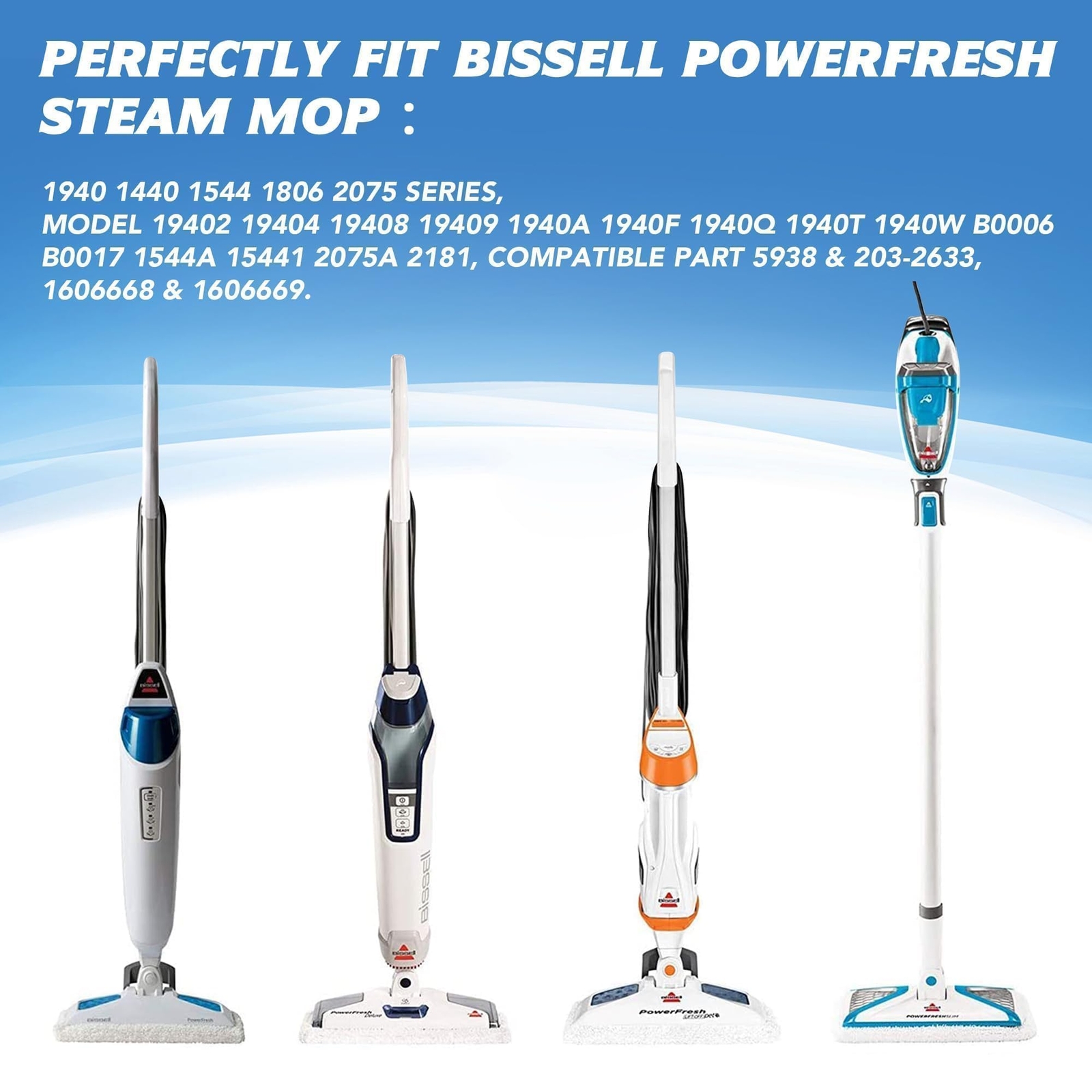 For bissell powerfresh steam mop can compatible with 1940 Series,19402, 19408, 19409, 1940A, 1940F, 1940Q, 1940T, 1940W, B0006, 1806, 15441, 1544, 15443, 15446, 15448, 1544A, 1544B. Applicable Model: Perfectly fit Bissell Powerfresh Steam Mop 1940 1440 1544 1806 2075 series, model 19402 19404 19408 19409 1940a 1940f 1940q 1940t 1940w B0006 B0017 1544A 15441 2075A 2181, compatible part 5938 & 203-2633, 1606668 & 1606669. Top Quality Microfiber: Machine Washable and reusable, have strong water absorption, dry fast and super durable. Multipurpose: Work well on floor such as: hardwood floors, laminate floors, ceramic tile, marble floors and other sealed hard floors. Very Practical: The pads with scrubbing strips work great on tough, stickier messes. Machine Washable: Just toss in the washing machine to renew the fiber and re-use!