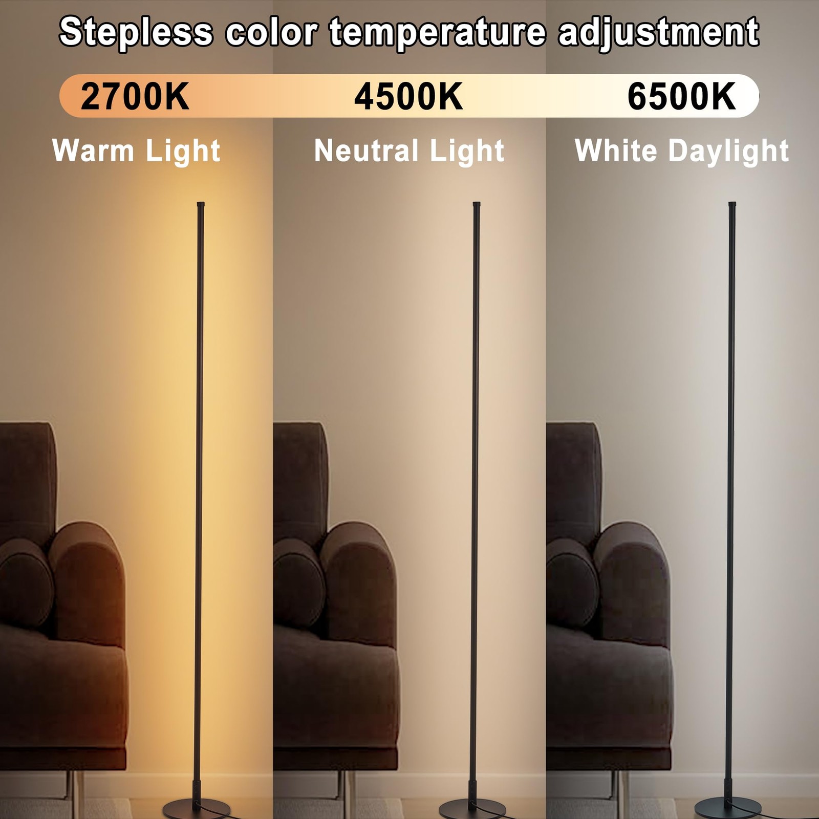 Stepless Dimmable: Adjust the brightness from 10-100% to provide comfortable light, the floor lamp is gradually dimmable, allowing you to customize the brightness according to life or work needs, such as living room, bedroom, office, foyer, den, study room. Remote Control & Foot Control: The floor lamps can be controlled by remote control or by pressing a switch. The effective control distance of this remote controller is 40 meters. Simple Slim Tall Lamp: The minimalist lamp is space-saving, this small lamp doesn’t take up much space. Just put this standing lamp beside a corner or a couch, showing a refined and modern interior design. Stable and Sturdy: Corner Lamp made of high-quality aluminum, has a slender stem with a weighted but compact lamp base, heavy metal base plate keeps the lamp sturdy in place and wobble free, stable and durable, which prevents it from tipping over when moving it or an accident occured. Long Lasting and Safety: Features over 30,000 hours long life with normal use, the LED floor lamp never needs to replace a bulb and is energy saving. It will never overheat and stay cool to avoid accidental burns if moving the corner lamp 【Minimalist Lamp】 The slim and straight black metal lamp pole gives the mood floor lamp a sleek and modern appearance, with a compact stem, the pole doesn't take up much space, almost hidden in the environment, just place it in a corner or next to the sofa to enhance your space, creating a stylish and elegant look. 【 Energy-saving, Super Long Life 】Compared with traditional bulb floor lamps, our floor lamp for living room use LED light source, higher brightness and more energy efficient. This LED floor lamp can last up to tens of thousands of hours, which reduces the replacement frequency and maintenance costs, making it a truly excellent solution for room lighting 【Dimmable】This standing lamp has 4 different color temperature setting (2700K to 6500K) and 10%-100% dimmable brightness. Whether you want comfortable home ambiance or a bright work environment, one-button control. 【Dual Mode Control】This LED floor lamp adopts dual control system of remote control and foot control, which gives you more choices. Via remote control, turn on the reading or night light mode with one button, both the elderly and children can quickly get started 【Best Customer Service】: Except for premium quality products, we also provide excellent after-sales service. We offer 1 year all our LED floor lamps. If you have any problem with our standing lamps, just feel free to contact us by clicking the “Contact Seller” on the details page. We will provide you a satisfied solution.