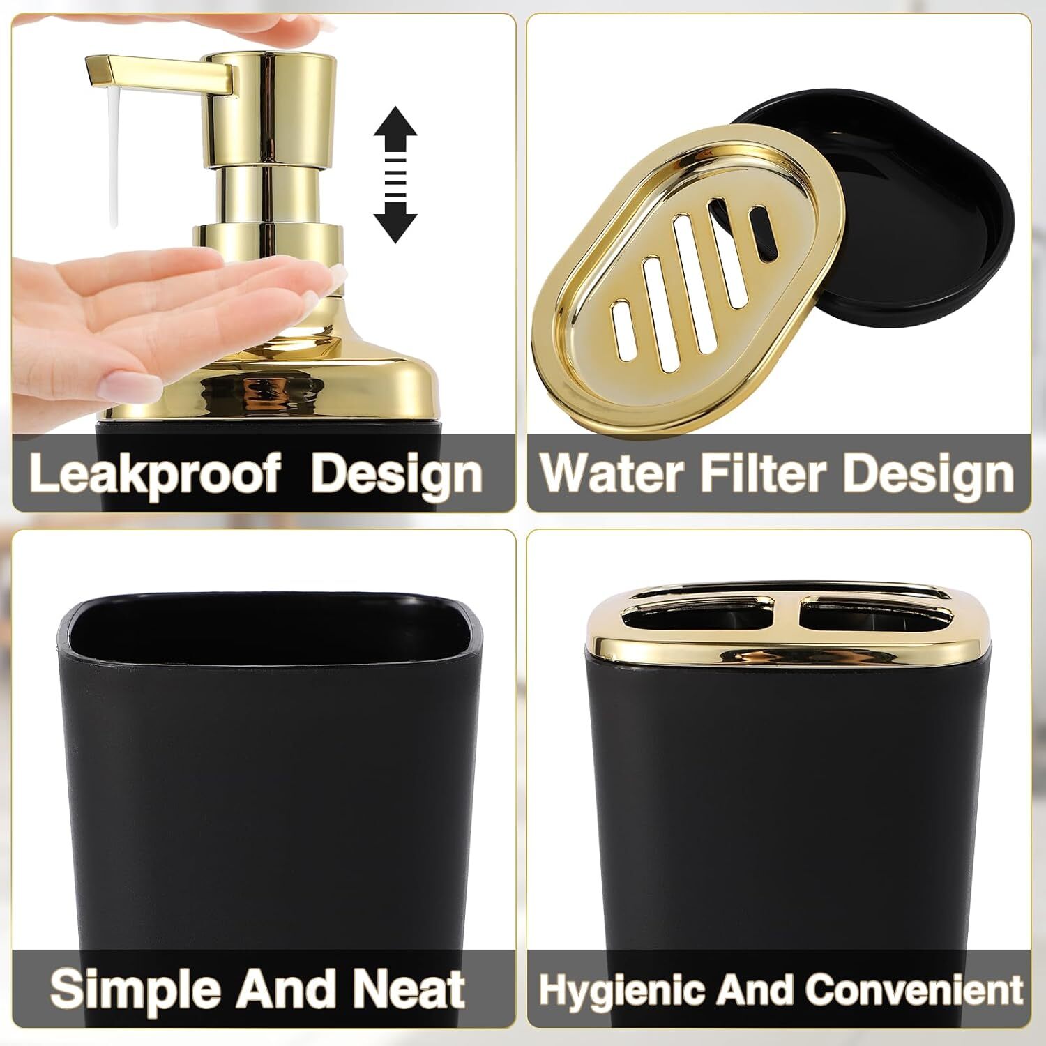 Luxury Bathroom Upgrades-we have carefully designed this black and gold bathroom set. Our bathroom kit accessories set complete including black and gold trash can with pedal, a Lotion Dispenser,Toothbrush Holder,Toothbrush Cup,toilet brush,Vanity Tray,Soap holder. Bringing the ultimate in quality and convenience to your bathroom. Durability Materials-Black and gold bathroom accessories Set Made of selected durable stainless steel materials and plastic materials are selected to ensure durability and rust resistance. Whether you use it daily or for a long period of time, it will keep its original appearance and add a touch of timeless splendor to your bathroom. Easy to clean-Our black and gold bathroom accessories sets complete not only provide high quality stainless steel trash cans and beautiful plastic accessories set, but also focus on easy-to-clean design. black and gold Stainless steel trash can has a smooth surface that is easy to wipe down, plastic accessories set are simple to maintain, and the waterproof design. Fully functional set-From black and gold trash cans to toilet brushes, from toothbrush holders to soap holder, each accessory is carefully selected to meet your daily needs. Our black and gold bathroom set complete not only practical, but also beautiful, make your bathroom space more neat and comfortable. Plus, with our exquisite bathroom accessories toothbrush holder set, your dental care essentials will be elegantly organized, adding both functionality and style to your daily routine. Create a new bathroom experience-This black and gold bathroom trash can set provides you with an all-around bathroom experience and gives your bathroom a new look. The black and gold bathroom accessories set complete not only a simple trash can, but also a thoughtful assistant for your life, adding more convenience and comfort to your life!
