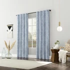 Featuring an intricately embroidered paisley pattern, Pedra Paisley Embroidery 100% Blackout Back Tab Curtain Panels add delicate detail to any living space. Equipped with back tabs for easy hanging on standard curtain rods up to 1.5" in diameter. Extreme Blackout™ Thermal Lining is laboratory tested to block out 100% of light, reduce outside noise by up to 40%, and decrease energy lost through your windows by up to 40%. Comfort is optimized with thermal properties that help keep summer heat and winter chill out of your home. Built-in metal grommets allow for easy slide-through installation on curtain rods up to 1.5" in diameter. Hang in your entertainment room to eliminate screen glare and reduce distracting outside noise, or in your bedroom for enhanced privacy and a sounder, more uninterrupted sleep. Sold as individual panels measuring 40" width by 84" length in color tranquil blue. Measure carefully before selecting your desired size and quantity. Rod not included. Machine wash cold on gentle cycle. Use non-chlorine bleach when needed. Tumble dry on low heat, using a cool iron as needed. Intricately embroidered paisley pattern adds delicate detail Extreme Thermal Blackout technology blocks out 100% of outside light Thermal properties help keep summer heat and winter chill out of your home Noise reduction up to 40% helps you get a sounder, more uninterrupted sleep back tabs fit curtain rods up to 1.5" in diameter Panels sold individually. Measure carefully prior to purchase (Image features 2 panels)