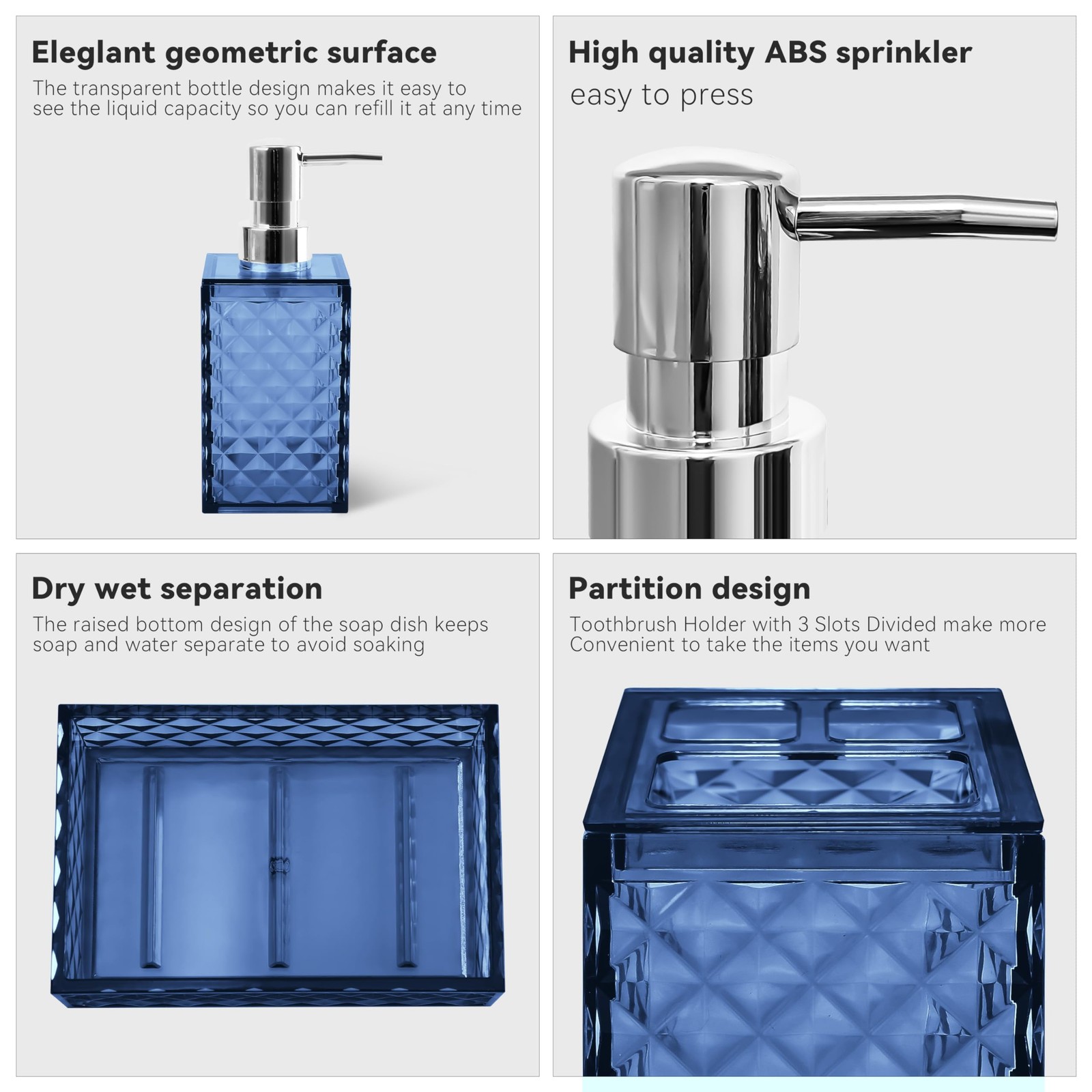 Bathroom Accessories Set This simple and elegant diamond pattern bathroom accessory set is perfectly matched with many types of bathroom decorations, making your bathroom no longer boring, greatly enhance your bathroom decoration, and make the bathroom supplies clean and tidy. Specification: Item type: Bathroom accessories set Color: Blue Feature: Diamond pattern design Quantity: 4 Pack Material: Safe and durable material Those products are made of thickened plastic, don't worry that it will be as easy to break like ceramics or glass. The accessories set can accommodate all bathroom necessities. Package include: A suit contain 1 soap dispenser, 1 toothbrush holder, 1 toothbrush cup, 1 soap dish,which can meet basic bathroom supplies storage needs. Multi-purpose soap dispenser This bottle can put many things, such as liquid soap, shower gel or lotion packaging. Simple toothbrush cup and mouthwash cup Your toothbrush has a fixed place, and it will not be messy. The separation of the toothbrush and mouthwash cup will be cleaner and hygienic. Soap boxes Thick plastic soap boxes are more durable and not easy to mold. This is a perfect gift for family members, friends, relatives, colleagues, customers, neighbors. Diamond Pattern Design: Diamond represents luxury and shining. Our 4pcs bathroom accessory sets adopt diamond pattern design, which can not only enhance the aesthetic value of the bathroom suit, but also add more flash points to your bathroom. You have several color options, the bathroom accessory set is suitable for various bathroom themes Sturdy And Safe Material: Our bathroom set accessories are made of premium plastic, easy to clean, sturdy, and durable, making your bathroom out of the ordinary Bathroom Soap Dispenser And Toothbrush Holder Set: The soap dispenser pump is easy to press, will not leak, is sturdy and durable, and has a long service life. Great for liquid hand soap, dish soap, lotion, shampoo, body wash, hand sanitizer and more. Our toothbrush holders fit most sizes of electric toothbrushes, toothbrushes, toothpaste tubes and razors. The thickened plastic material ensures it's shatterproof, can withstand drops well 4 PCS Bathroom Accessory Set: Includes 1 x soap dispenser, 1 x toothbrush holder, 1 x soap dish and 1 x mouthwash cup. Our modern bathroom accessories set keeps the bathroom organized and has a minimalist design that perfectly complements your bathroom decoration Ideal Decoration For Bathroom: Classic blue color and silver cover form a very simple decorative element that harmonizes with most styles, adding a more modern or fashionable touch to your home Giftable: Functional and beautiful design makes these 4 pieces of bathroom accessories set a great gift for a housewarming, wedding, birthday, Mother's Day, Thanksgiving Day, Christmas, and also for mom, sister, colleague, and friends