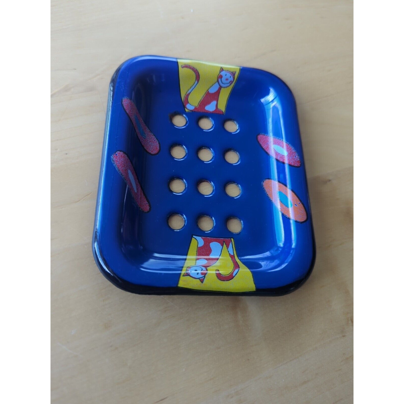 Blue Metal Enameled Soap Dish With Cat Decor. Condition is Used. Shipped with USPS Ground Advantage.
