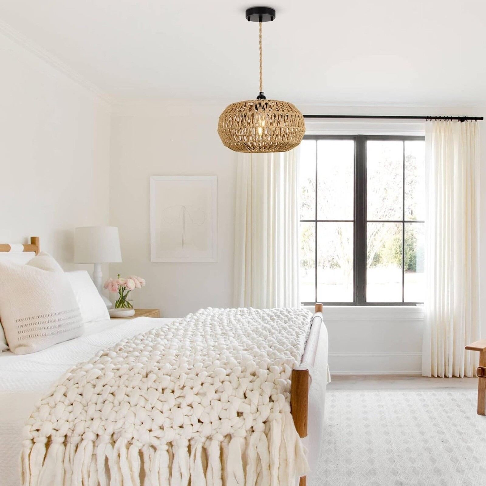 Product Information Main Color: Brown Main Material: Rattan+Metal Product Dimensions Item Length (in.): 12.99 Item Width (in.): 12.99 Item Height (in.): 7.09 Weight (lbs.): 2.66 Package Size Length (in.): 12.99 Width (in.): 12.99 Height (in.): 7.09 Weight (lbs.): 2.86 Product Features ❤【Bohemian Design & Eco-friendly】Our rattan pendant light is made of 100% hand-woven natural rattan wrapped around a metal cage, assembled with hemp rope cord, selected natural rattan makes the woven light fixture more eco-friendly and durable. The unique shape of the wicker lamp creates a farmhouse, bohemian style. When lit, the light from the shade projects a very beautiful pattern on the wall! This pendant light fixtures is the best choice for decor or gift to your friends and family! ❤【Size & Widely Applications】The boho chandelier light fixture lamp shade Width: 11.8", Height: 6.9",the hemp rope cord Length: 47.2"(can be adjusted). The basket pendant light can be adjusted in height according to the home decor and is perfectly suitable for dining room, living room, bedroom, kitchen, nursery, hallway, entryway, foyer, reading nook, sitting area, loft, plant area, etc. ❤【Safety & Bulb Included】Our kitchen hanging light fixtures include an dimmable LED bulb (E26 base), you do not need to purchase a bulb separately. The pendant lights kitchen island has a UL listed E26 socket, which gives you more security in using the fixture, and is compatible with incandescent/vintage filament/halogen/LED bulbs. ❤【Extremely Easy to Install】The entryway light fixture hanging includes installation instructions and all accessories needed for installation. Installation is quick and easy and takes only a few minutes to successfully install and make this dining room light fixtures over table light up.