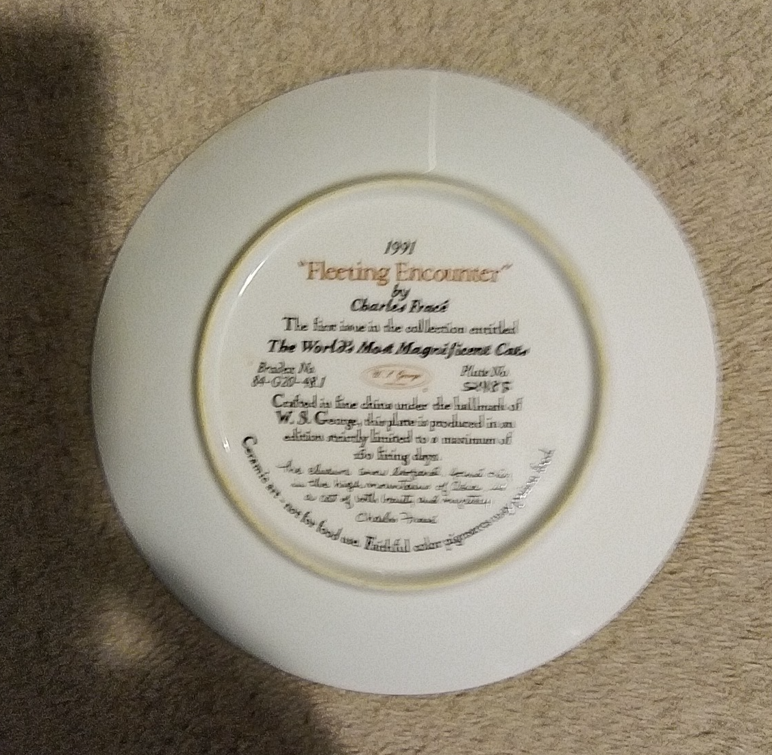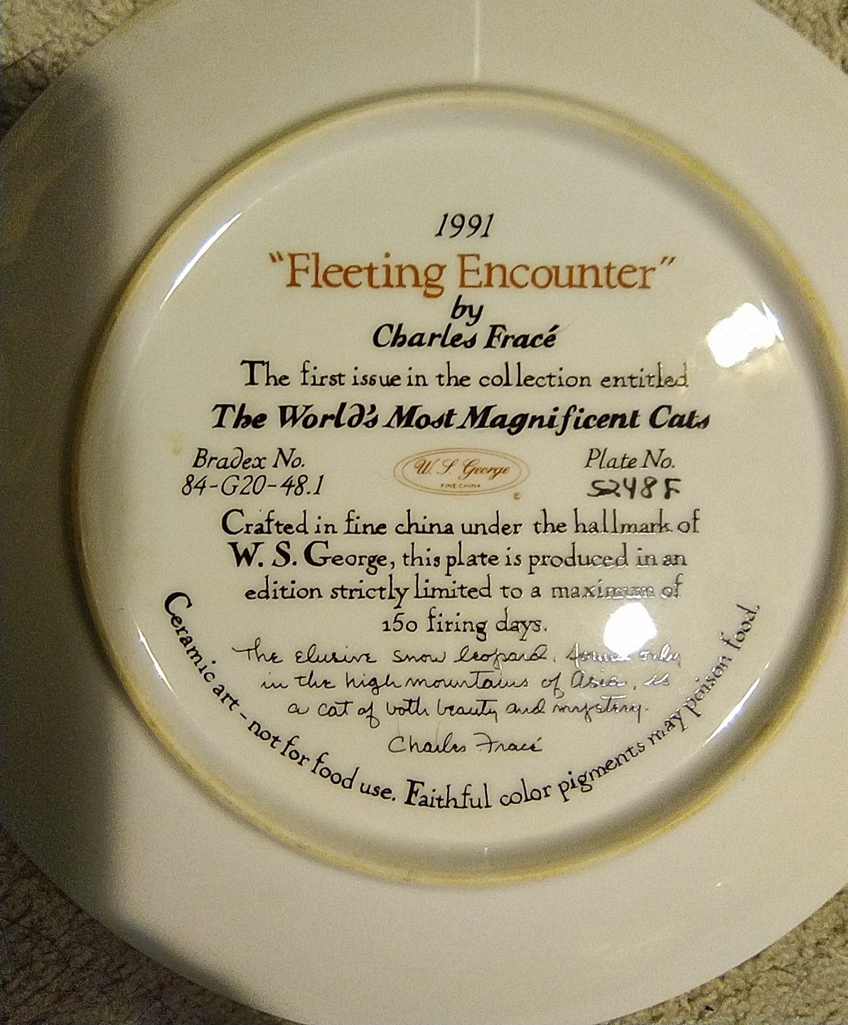 The product is a vintage collector plate from Bradford Exchange featuring a snow leopard design from the "World's Most Magnificent Cats" series. Made of ceramic, the round plate has a diameter of 8.5 inches and comes with a stand. With a decorative style and themes of cats, this collector plate is part of an art pottery production style and was manufactured in the late 20th century, specifically in the 1990s. This multicolored plate is perfect for all occasions and adds a touch of American culture to any collection of decorative collectibles. You Will Receive The Item(s) Pictured. We Do COMBINE SHIPPING So Take A Look At Our Other Items. If You Would Like To Take Advantage Of The COMBINED SHIPPING Please Wait For Invoice Before Payment. If You Have Any Questions We Will Be Happy To Answer Them.
