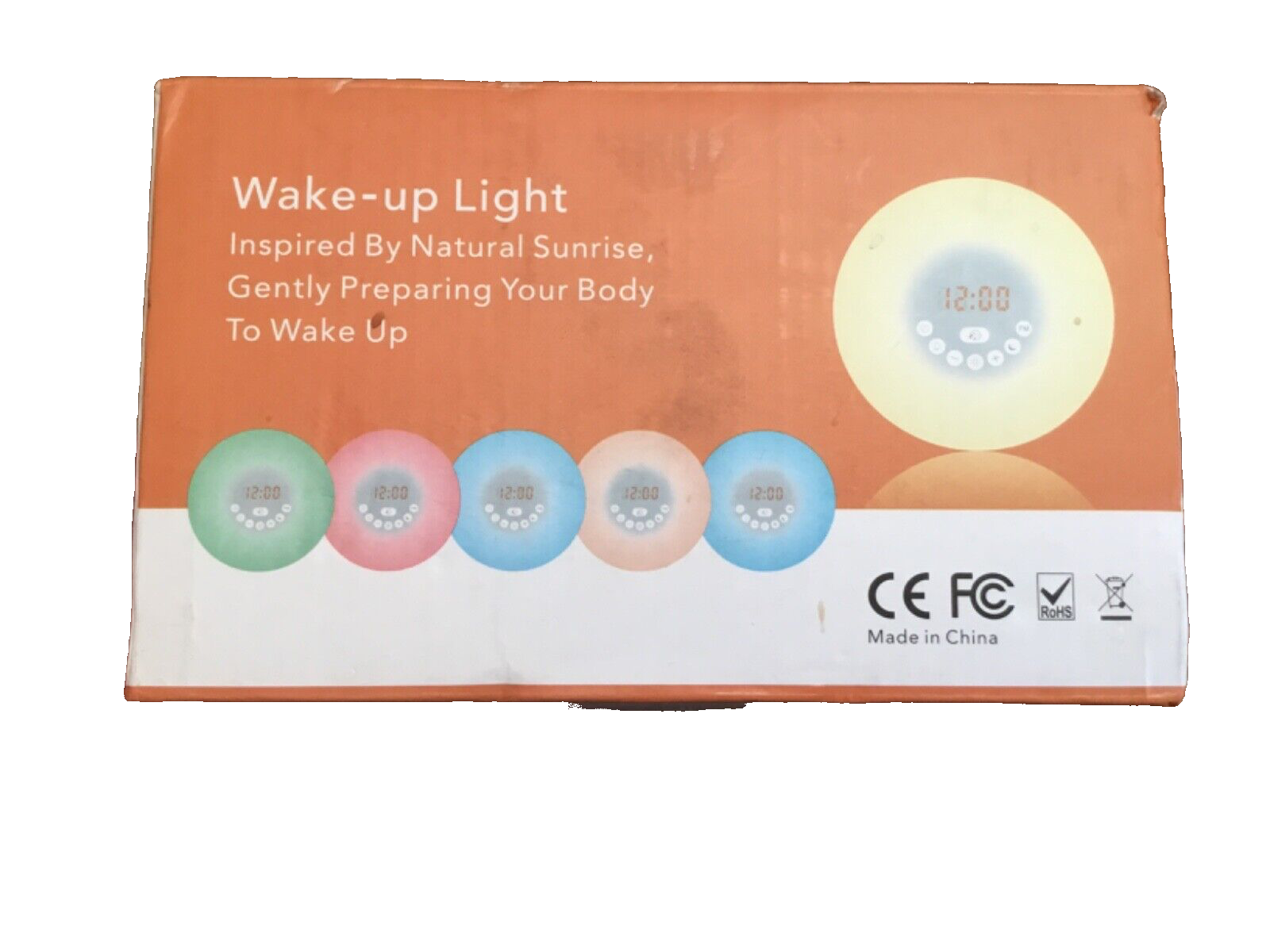 This is a white round clock radio featuring a wake-up light, digital display, and quartz movement. It can be powered by USB or batteries, making it suitable for use in the bedroom. The design is nature-themed and made of plastic. It also includes a radio feature. This product comes in its original packaging.