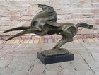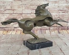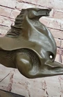 Bronze Marble Statue Wild Horse Stampede Mustang Ranch Equestrian Deco Farm Sale Bronze Marble Statue Wild Horse Stampede Mustang Ranch Equestrian Deco Farm Sale Condition : This sculpture is in perfect condition Bronze Dimensions with Marble Base: Height 11" X Width 19.5" Marble Dimensions:6" X 5" Height without base:10" Weight: 13 LBS Inventory:72K0618127 This captivating abstract and modern bronze sculpture captures the unbridled energy and spirit of a galloping horse. Rearing up against an invisible wind, the horse lets out a wild neigh, embodying the raw emotion and power of nature. The flowing, undefined mane conveys dynamic movement, while fine linear lines etched into the body emphasize the creative force behind the piece. The abstract design seamlessly merges the horse's hind legs with the base, providing both structural support and artistic continuity. This handcrafted sculpture, cast using the ancient “Lost Wax Method,” features a rich dark brown patina that enhances its depth and texture. 100% bronze and entirely handmade, this remarkable work of art is signed by the artist Milo, whose mastery in capturing motion and emotion is evident in every detail. A stunning centerpiece, this sculpture celebrates the wild beauty of the horse and the boundless creativity of abstract art. Shipping Terms : Most of our items are shipped via USPS (United States Postal Service) mail or UPS. Most orders are shipped within 24-48 hours of purchase. Please be aware that not all items are available for USPS shipping due to size and weight. We do ship to Hawaii, Alaska, Canada, Puerto Rico, APO/AE, and U.S. Virgin Islands, however, an additional charge may be required. Please contact us before making any purchases in these areas. For Non-USA customers, you may be responsible for all duty, tax, brokerage fees that may be due upon delivery (shipping costs cover freight charges only). We also ship internationally. Please refer to the "Shipping and Handling" chart for the rates for each area. Payment : We accept just about any form of payment. PayPal, Master Card, Visa or American Express credit cards. Money orders, cashiers checks, and even personal or business checks. For governmental institutions, we will also accept a purchase order. Please understand that for personal or business checks we have to wait for the check to clear (usually 7 days) before shipping. Condition : New Detailed Hand Crafted Hot Cast Bronze Satisfaction Guaranteed. This is Stock Photo, Slight Color Variation!! Listing and template services provided by inkFrog
