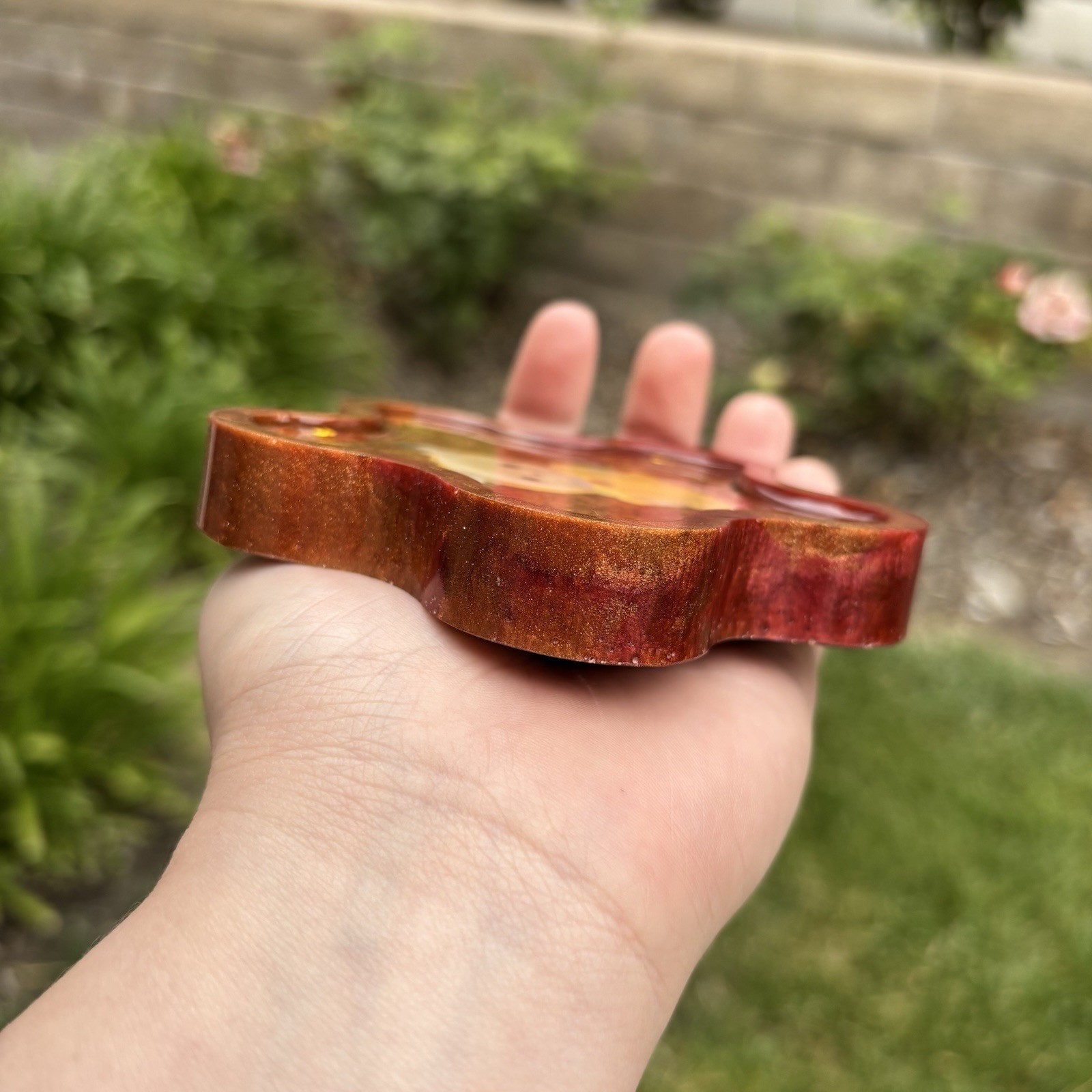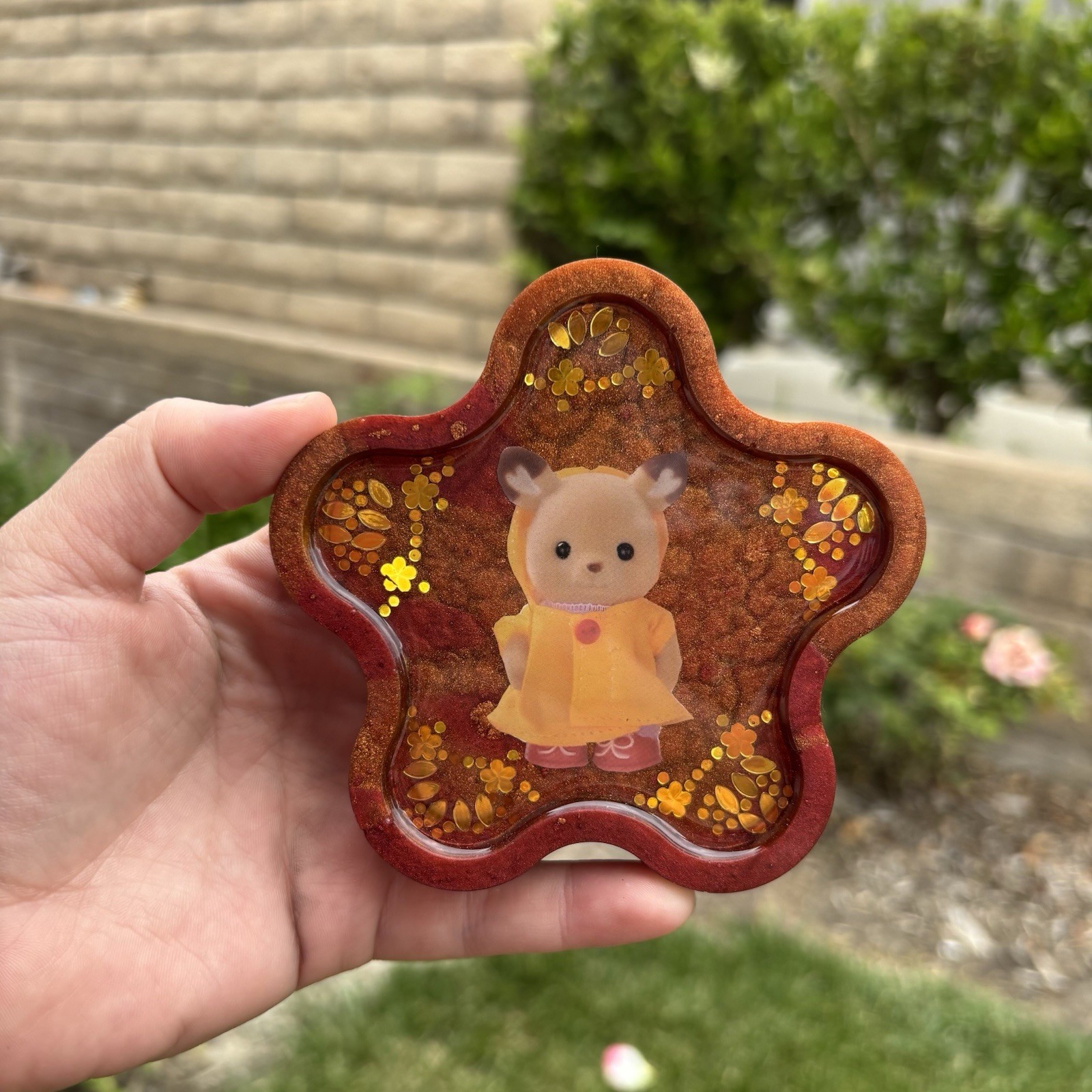 ‘Gold In Showers’ Calico Critters Inspired Colorshifting Maroon and Gold Toned Flower Shaped Resin Coaster Handmade by Shop EarthySmurf. *Please note, resin is an imperfect art. Craters, holes, sharp edges, bubbles and more may be present in your piece. Please examine all pictures*