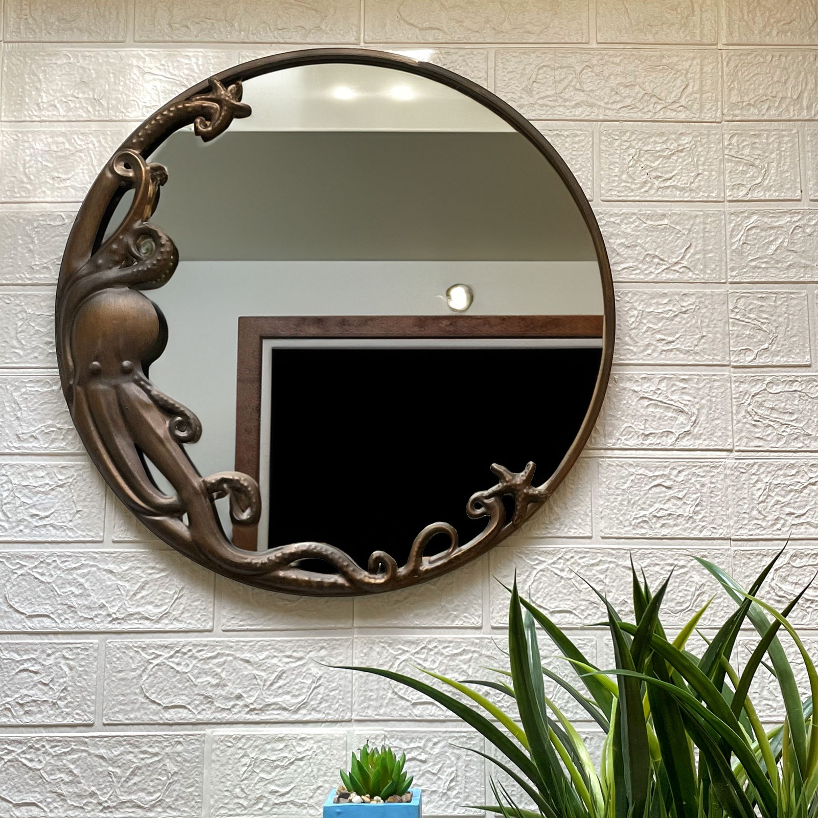 Perfect Dimensions: Measuring 20 inches in diameter and 1 inch deep, this mirror provides a substantial presence that elevates your living space beautifully. Durable Construction: Crafted from robust metal with a luxurious bronze finish, this mirror ensures lasting beauty and functionality for years to come. Intricate Design: Featuring an enchanting octopus frame, this mirror adds a whimsical, marine-inspired touch to your home decor, perfect for ocean lovers. Our eBay Store About Us Add to Favorite Sellers Bronze Octopus Wall-Mounted Mirror – 20-Inch Diameter Decorative Accent for Nautical and Coastal Home Decor, Unique Focal Point for Living Room or Bathroom. Perfect Dimensions: Measuring 20 inches in diameter and 1 inch deep, this mirror provides a substantial presence that elevates your living space beautifully. Durable Construction: Crafted from robust metal with a luxurious bronze finish, this mirror ensures lasting beauty and functionality for years to come. Intricate Design: Featuring an enchanting octopus frame, this mirror adds a whimsical, marine-inspired touch to your home decor, perfect for ocean lovers. Versatile Accent: Ideal for living rooms, bathrooms, or entryways, this octopus-framed mirror serves as a captivating focal point in any nautical-themed room. Easy Installation: Equipped with two keyhole wall hangers spaced approximately 7.5 inches apart, it allows for quick and secure mounting on any wall. Enhance your living space with this stunning wall-mounted mirror featuring an intricate octopus frame. Crafted from durable metal with a rich bronze finish, this mirror combines elegance with strength, making it a striking addition to any decor. Measuring 20 inches in diameter and 1 inch deep, it offers a substantial presence that draws the eye and elevates your surroundings. The frame showcases captivating octopus details, beautifully finished in bronze, imparting a timeless, nautical charm that resonates with ocean-inspired themes. Designed for effortless installation, the mirror includes two keyhole wall hangers spaced approximately 7.5 inches apart, allowing you to secure it with just a single nail or screw. Ideal for living rooms, bathrooms, or any space where you want to create a marine-inspired ambiance, this mirror serves as a captivating focal point. Whether you're aiming to evoke a coastal retreat or simply want to introduce a unique artistic element, this octopus-framed mirror is the perfect choice for enhancing the aesthetics of your home while adding a touch of whimsy and sophistication. Product Details Color Bronze Height 20 Length 20 Weight 5.95 LB