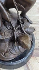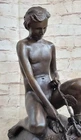 Condition : This sculpture is in a perfect condition. Bronze Dimensions with Marble Base: Height 13" X Width 9" Marble Dimensions: Diameter 9" Height without base:12" Weight:15 LBS Inventory:18Y20525981 Joyful Boy Riding a Turtle by A. Mercie This captivating sculpture depicts a young boy joyfully riding a turtle, showcasing an endearing scene filled with youthful exuberance and playfulness. The artist has meticulously crafted every detail, from the turtle's closed eyes, reflecting its frustration, to the boy's joyful expression as he enjoys the playful ride. The sculpture captures a moment of innocent mischief, with the boy, completely nude, using a rope threaded through the turtle's mouth for a secure grip, showcasing a whimsical interaction between the child and his pet. Detailed and Expressive Craftsmanship The sculpture is a remarkable representation of the bond between the boy and his turtle, highlighting a playful dynamic where the boy seems to take advantage of the turtle's size and slow pace. The expressions on both figures are finely detailed, with the turtle appearing slightly annoyed but compliant, and the boy radiating delight and mischievous energy. This piece beautifully captures the essence of childhood curiosity and the innocent exploration of one's surroundings. Timeless Bronze Artistry Crafted using the ancient "Lost Wax Method," this sculpture is a testament to traditional bronze casting techniques, ensuring high-quality craftsmanship and lasting durability. The piece is handmade in 100% bronze, with a rich patina finish that adds depth and character. It is mounted on a smooth, black round marble base, providing a stable and elegant foundation. Signed by the artist A. Mercie, this sculpture is not only a delightful decorative piece but also a fine example of artistic expression and craftsmanship. Perfect for art collectors and those who appreciate the charm of childhood memories, this sculpture will be a treasured addition to any collection. Signed Mercie Nude Boy Riding Turtle Bronze Sculpture Marble Base Figurine Decor Video will open in a new window Using the eBay App? Paste link into a browser window: [isdntekvideo]