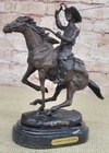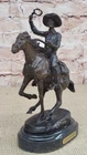 Condition : This sculpture is in perfect condition. Bronze Dimensions with Marble Base: Height 9" x Width 10" Marble Dimensions: Diameter 6" Height without base:8" Weight:7 LBS Inventory:49-631204594 This captivating bronze sculpture immortalizes a fearless cowboy in the midst of a gripping struggle with his untamed stallion. The scene exudes the essence of the Wild West, as the seasoned cowboy demonstrates unwavering courage and determination. Despite the relentless efforts of the bucking horse, the cowboy's grip on the reins remains unbroken. Dressed in classic cowboy attire, complete with a shirt, chaps, and boots, the rider embodies the spirit of the American frontier. The intricately detailed sculpture captures the dynamic movement of both horse and rider. The horse's saddle stays securely in place as it kicks and leaps, while the cowboy's body rolls with the relentless motion. Crafted using the time-honored "Lost Wax Method," this sculpture exemplifies the artist's dedication to preserving the essence of this challenging encounter. The brown patina finish adds depth and character to the piece. Mounted on a black marble base and signed by the artist Thomas, this sculpture stands as a testament to the resilience and indomitable spirit of those who conquered the untamed West. Original Seasoned Cowboy on Horse Western Old West Bronze Sculpture Statue Gift www.bronzhaus.com Video will open in a new window Using the eBay App? Paste link into a browser window: [isdntekvideo]